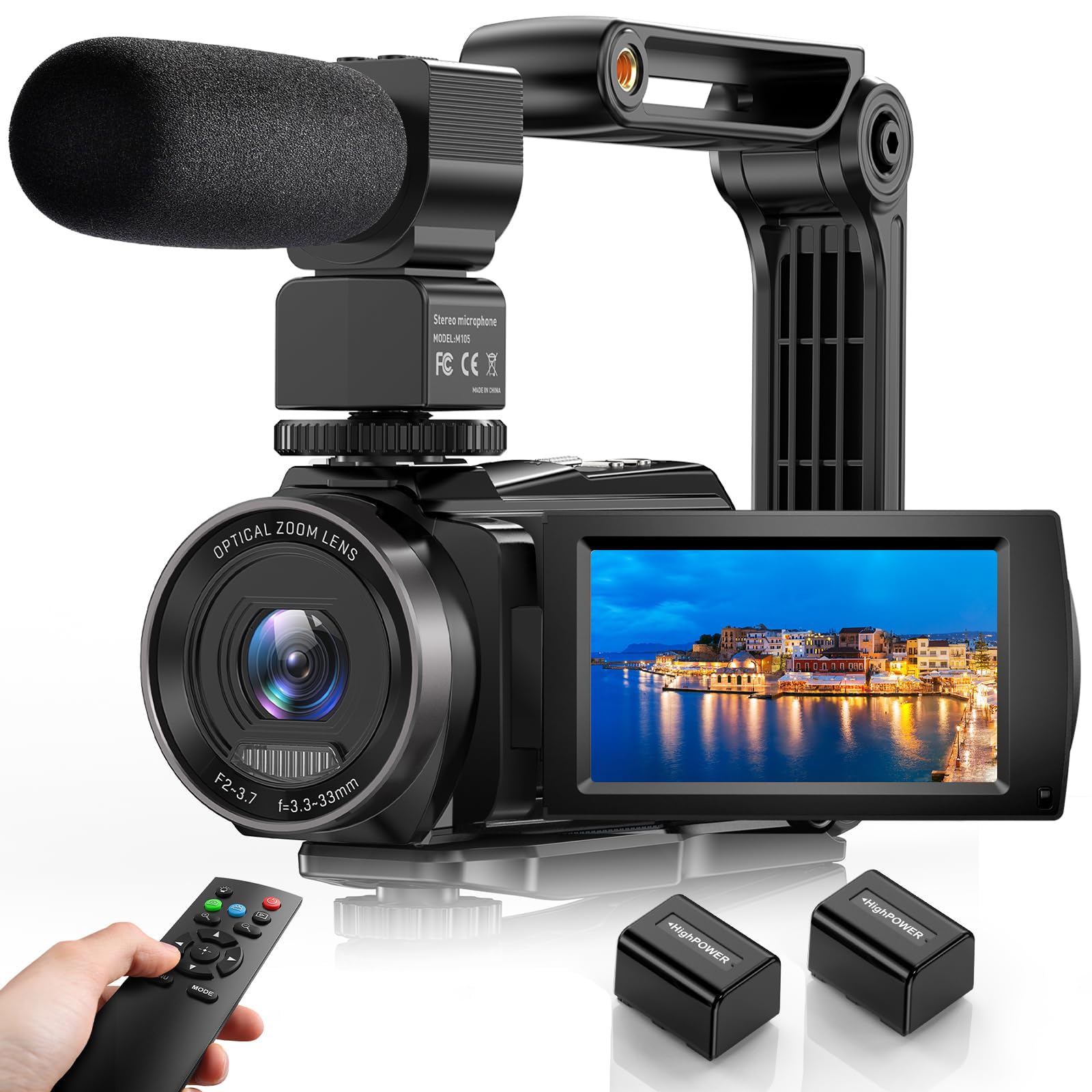 Warm Tips:1. Please carefully read the user manual before using video camera. 2. The camcorder is designed for the amateurs, not for the professionals.(Autofocus & optical zoom are not supported). 3. The camcorder doesn't support manual focus, the lens is fixed. Please keep a shooting distance above 1.5m/4ft to take a clear picture or video. 4. Please format the memory card through this camera for the first time use (Support 4-256GB SD card, NOT Included,a Class 10 or higher memory card is required). Camcorder Specifications:Video Resolution:5K 30FPS; 4K 30FPS; 2.7K 30FPS; 1080P 60FPS; 1080P 30FPS; 720P 60FPS; 720P 30FPS Image pixel : 48M,36M,24M,20M,16M,12M,8M,5MMemory card :4-256GB SD card,Support SDXC C10 U1 grade and above (not included) Picture format :JPG Video format :MP4 USB interface :USB2.0 Screen size :3-inch IPS touch display Focusing :Aperture F=2.2, focal length f=3.37mm Hot boot seat jack :External microphone and fill light ( fill light is not included)Tripod interface ;Standard 1/4 inch screw opening Built-in microphone :Yes Focus Mode :Fixed-focus Operating system :Windows XP、Windows Vista、Windows7、 Windows 8 、Windows 10、Windows 11、 Mac 10.2 white balance :Automatic, daylight, cloudy day, incandescent lamp, fluorescent lamp (H), fluorescent lamp (L) Automatic Shutdown: 1 minutes/3 minutes/5 minutes / off 5K Video Camcorder Function:16X Digital zoom WIFI Wireless Transmission Webcam PC Cam HDMI Output Infrared Night Shot Remote Control Slow Motion Time-lapse Pause Function Anti-shake Face Detection Continuous Shooting Package Included:5K Video Camera x1 Handheld Stabilizer x1 External Microphone x1 Lens Cover x1 Lens Hood x1 HDMI Cable x1 USB Cable x1 Charging Adapter x1Remote Control x1 Camcorder Bag x1 User Manual x1 Rechargeable Lithium Batteries x2 【5K UHD VIDEO & 48MP PHOTO CAMEAR】This Video Camera records videos up to 5K resolution at 30FPS and high-resolution 48MP photos with this camcorder.The 5K video camera records videos in 2.7K, 4K, 5K HD resolution, ensuring smooth and stable video recording. The 3-inch IPS touch screen ,16X digital zoomand 270 degrees rotatable youtube camera allows you to capture and watch with precision.The high performance is suitable for family daily shooting and video production enthusiasts 【5K WIFI CAMCORDER & IR NIGHT VISION】The 5K video camera supports wifi wireless transmission,Downloading "iSmart DV2" APP, easy to connect the camcorder with Android/iOS smartphones and tablets. Then you can browse images, transfer, share movies and photos via your mobile devices, or remote control the camera by App. Just press ''OK'' button, this Youtube video camera with infrare LED light allows you to shoot clear white/black photos or videos in the dark 【WEBCAM FUNCTION & EXTERNAL MICROPHONE】The vlogging camera supports for video chatting and live streaming.just connect this 5k Video camera with computer through USB cable and choose “PC Camera” to enter webcam mode,and choose “General UVC Camera” on external camera of social media software.5K camcorder with microphone can eliminate background noise/wind noise effectively 【LENS HOOK & HANDHELD STABILIZER & REMOTE CONTROL】This camcorders video camera 5k comes with lens hook to block excess light and protect your camcorder lens from accidental damage. Foldable handheld Stabilizer holder Keep the 5K camera stable when recording. This 5K vlogging camera comes with 2.4G wireless remote, which can control this digital video camera within 60 feets from any direction. 【CONVENIENT MULTI-FUNCTION 5K CAMERA】This 5K Video Camera Camcorder support 4k/5k mode switch,pause function(click “photo”), face detection, continuous shooting, anti-shake, self-timer, time-lapse shooting, slow motion, recording while charging, will meet your different needs. HDMI output, Webcam, MSDC, USB 2.0 and up to 256GB SD card, support tripod and LED light (tripod and LED light not included) Packing List:5K Video Camera、Handheld Stabilizer、Remote Control、Microphones、Lens Hood、Charging Cable、2 Batteries、Camera Bag、Lens cover、User Manual