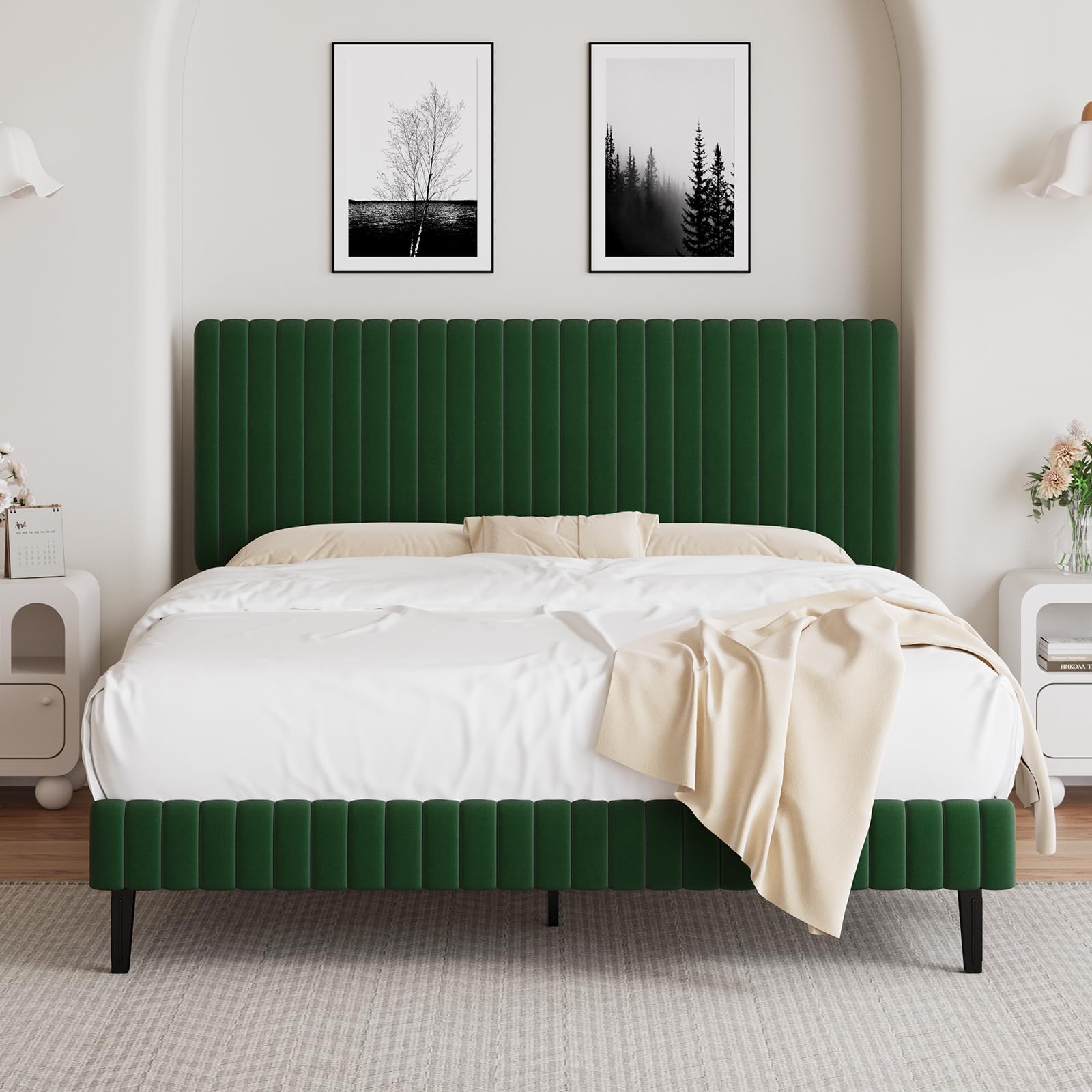 Description: This upholstered bed frame is made of high-quality metal and wood frame with a durable headboard. The platform bed frame with headboard has a classic straight-line design that will add a splash of color to your room. Features: - Modern velvet headboard and footboard - Straight line design gives you a more spacious feel - High-quality materials - Comfortable sleeping environment - Decorate your room Specification: Material: Wood, Metal, Velvet Size: Twin/Full/Queen/King Color:Pink/Black/White/Navy Blue/Green Style: Modern Package Contents: - 1 x Bed Frame - 1 x Accessory Kit - 1 x Instructions Spacious and Comfy—The king platform bed frame is wrapped in high-grade velvet fabric, which is comfortable to touch, and the 10.6-inch high platform design makes it easy to get in and out of bed Modern and Elegant—The adjustable headboard with straight lines makes the space feel more extended. At the same time, the square bed frame is classic and practical, suitable for any room decoration Sleep Peacefully—Each supporting leg is equipped with a foot pad, and the supporting rod is equipped with a sponge pad to reduce noise and ensure a good sleep Sturdy Frame Construction—The upholstered bed frame king features a solid steel frame and 12 sturdy wooden slats with 12 legs connected by screws for durability and stability Easy Assembly—Our velvet bed frame with headboard is designed for easy and hassle-free assembly. With clear instructions and all the necessary tools, you can quickly complete the installation in a short time