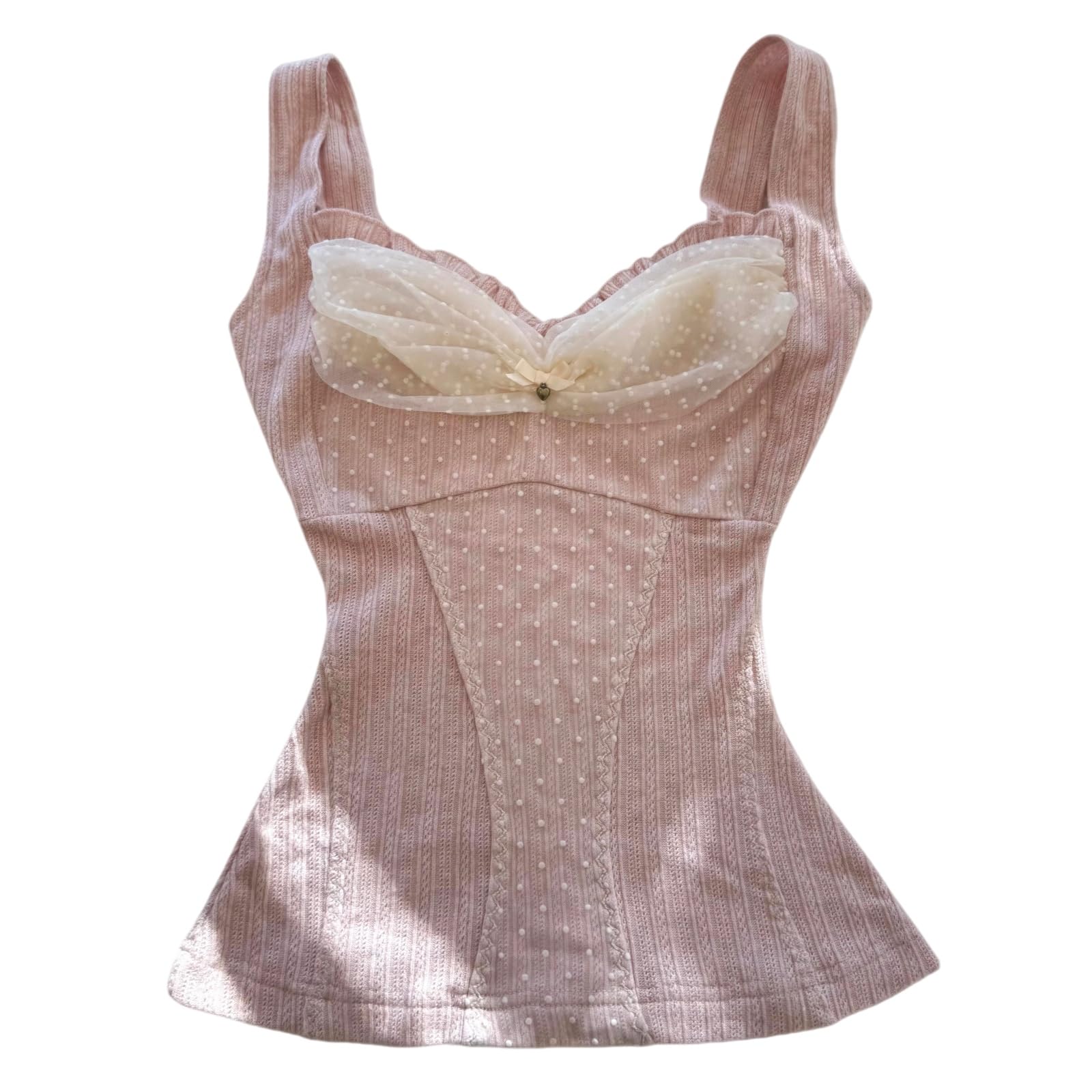 Women Fairy Grunge Tank Tops Vintage Aesthetic Lace Trim Cami Shirt Slim Fit Knit Ribbed Coquette Clothes: Pink White Medium