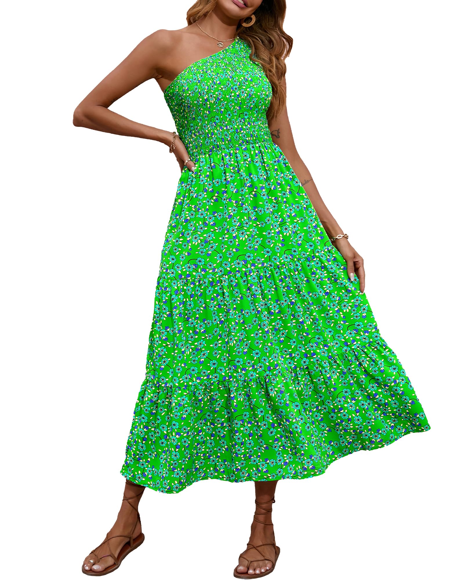 BTFBM 2025 Summer One Shoulder Dresses for Women Casual Sleeveless High Waist Floral Flowy Smocked Boho Beach Maxi Dress