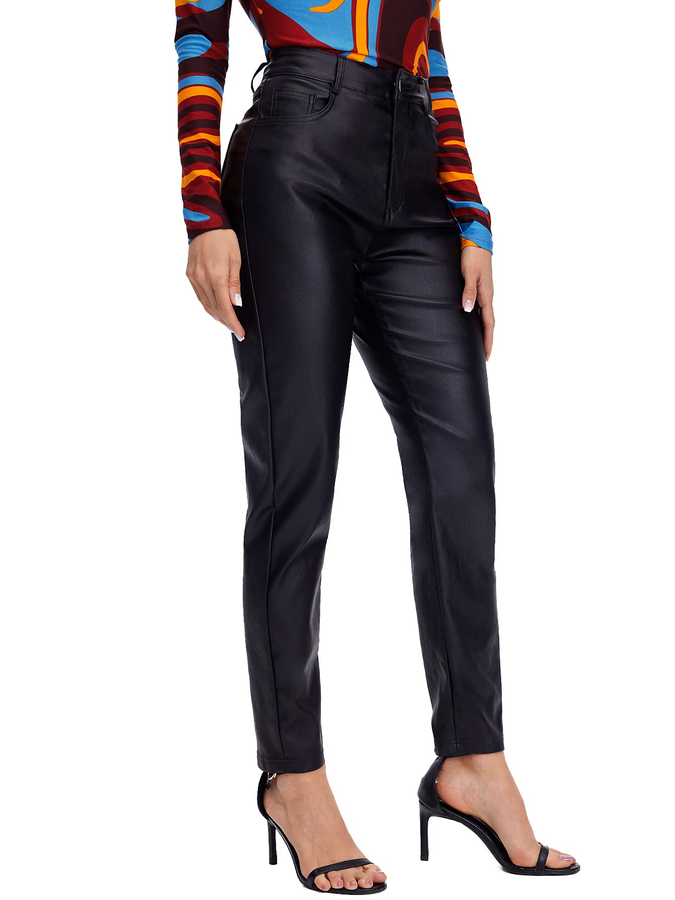 Fabric has some stretch, comfortable to wear Feature: high waist, button, zipper fly, leather look, pockets, solid color, casual straight leg jeans for women Machine washable, handwash recommend Occasions: suitable for casual daily wear Please refer to the last image for size chart (The size chart is clothes size, NOT human body size)