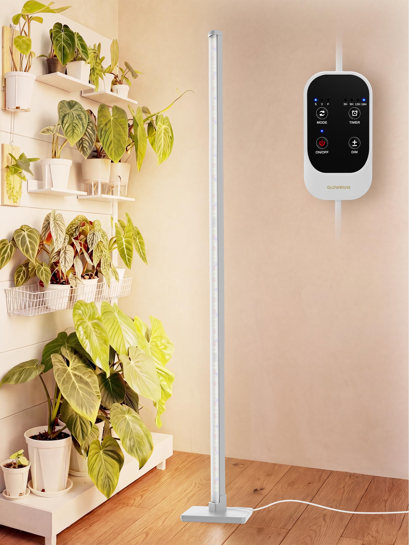 Healthy plants need consistent light, but natural sunlight indoors is often limited. The GLOWRIUM Vertical Grow Light Stand is designed to provide reliable lighting support for houseplants, herbs, succulents, and indoor gardens. With its tall vertical grow light design, this standing grow light for indoor plants delivers wide side illumination that helps multiple plants receive balanced light from different angles. Do vertical grow lights work for indoor plants? Yes. A vertical grow light spreads light sideways instead of only from above, which allows several plants placed around the lamp to receive even coverage. This makes it a great solution for plant shelves, plant corners, or small indoor gardens where traditional overhead lights may not reach every plant. Full Spectrum Light That Supports Plant Growth This vertical plant grow light features a balanced full spectrum LED system that includes 460nm blue light, 660nm red light, 3000K warm white, and 6500K daylight LEDs. These wavelengths help support plants during different growth stages including seedlings, vegetative growth, and flowering. With three lighting modes and six dimmable brightness levels, you can easily adjust the light intensity based on plant type and growth needs. Smart Timer for Effortless Plant Care Keeping a consistent lighting schedule is important for healthy plant growth. The built-in auto timer allows you to choose 3-hour, 9-hour, or 12-hour lighting cycles. Once set, the standing grow light will automatically turn on and off at the same time each day, helping your plants receive stable light without daily adjustments. Comfortable Lighting for Your Living Space The frosted lampshade creates soft, evenly distributed light that is comfortable for homes, offices, and indoor living spaces. Unlike harsh direct lighting, this design reduces glare while still providing effective illumination for plants. The aluminum and PC construction also provides efficient heat dissipation for long-lasting performance. Flexible Placement for Different Plant Setups Where should you place a standing grow light? Many plant lovers position it next to plant shelves, in plant corners, or beside larger houseplants. The grow light stand vertical design allows the light to reach multiple plants at once while saving floor space. The detachable structure also makes installation quick and simple. Whether you're growing herbs in the kitchen, maintaining houseplants in the living room, or creating a small indoor garden, the GLOWRIUM vertical grow light provides the consistent lighting plants need to grow stronger and healthier indoors. 【Vertical Grow Light】Latest Side Lighting Technology,Featuring a 120° beam angle, it provides larger and more even illumination, stimulating the growth potential of plants. The detachable design makes it easy to install and can also be hung, ensuring your plants receive optimal lighting in different settings. 【Full Spectrum Design】Using 460nm, 660nm, 3000K, and 6500K LEDs, it offers three growth modes: vegetative, flowering, and seedling stages. The brightness is adjustable, meeting the diverse growth needs of plants at different stages and providing the best lighting for your plants throughout their growth phases. 【Automatic Timer】With a timer function that can be set for 3, 9, 12 or 16 hours, you can choose the desired time, and it will automatically turn on/off at the same time each day. Simply set it once, and the light will operate according to your preset schedule, saving you time and effort while ensuring your plants receive optimal lighting for healthy growth. 【Low-Glare】The lampshade is made of frosted material, providing soft and non-dazzling light, ensuring you and your pets are not bothered by glare when the light is on. The body is made of aluminum and PC materials with a temperature rise of less than 20°, offering excellent heat dissipation and durability for long-term use. 【After-Sales Statement】GLOWRIUM solemnly promises to accept returns and exchanges for any quality issues. We encourage you to reach out to us through various after-sales channels for support, and we will steadfastly honor our commitment.