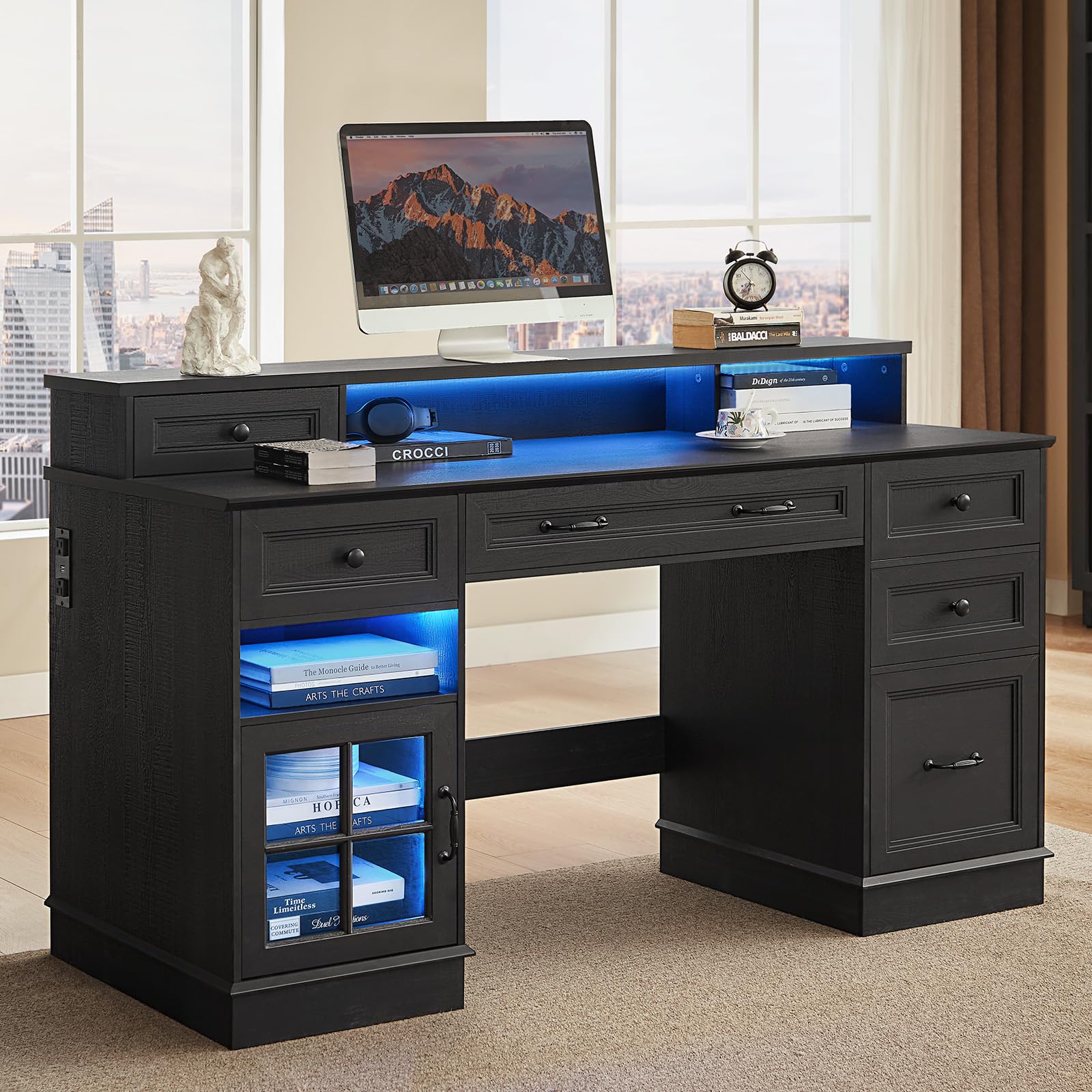 HAUOMS Farmhouse Executive Desk with Drawers Computer Desk with File Drawers, Power Outlet and Led Lights, Executive Office Desk with Storage Cabinet and Monitor Shelf for Home Office, Black