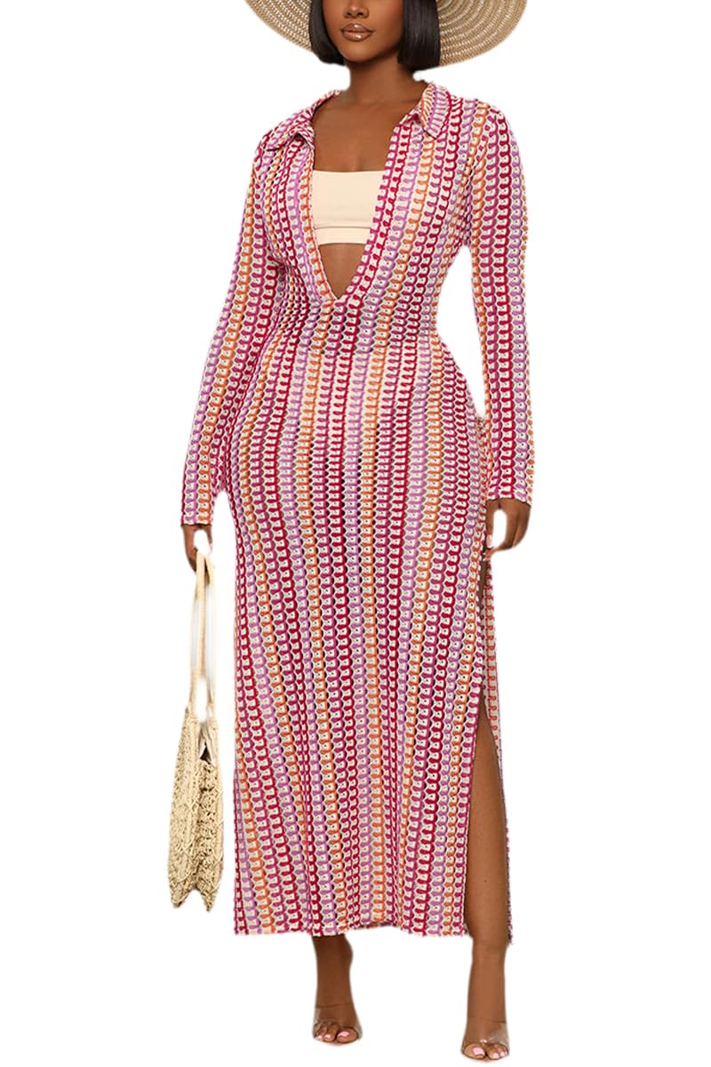 Women's Sexy Swimsuit Maxi Dress Long Sleeve Hollow Out Long Beach Cover Up Dress Feature:Long sleeve maxi long dress,striped see through cover up dress,contrast color dress,collared neck,v neck crochet,side slit, sexy hollow out beach sundress dress. Style:Swimsuit cover up dress,crochet bikini cover up dress,maxi cover ups for swimwear women,trendy casual vacation style,suit for spring, summer, fall. Match:Fashion striped hollow out dress perfectly match with bikini set,batching suit, swimsuits,sandals,high heels,sunglasses,clutches and other accessories,you got a lot of compliments on it. Occasion: The women v neck crochet maxi dress suitable for casual,street,holiday,night out,vacation,travel,holiday,club,party,birthday,water park,celebration,swimming pool,etc Size:S-2XL.Please kindly check our size chart to compare your measurements before purchase.