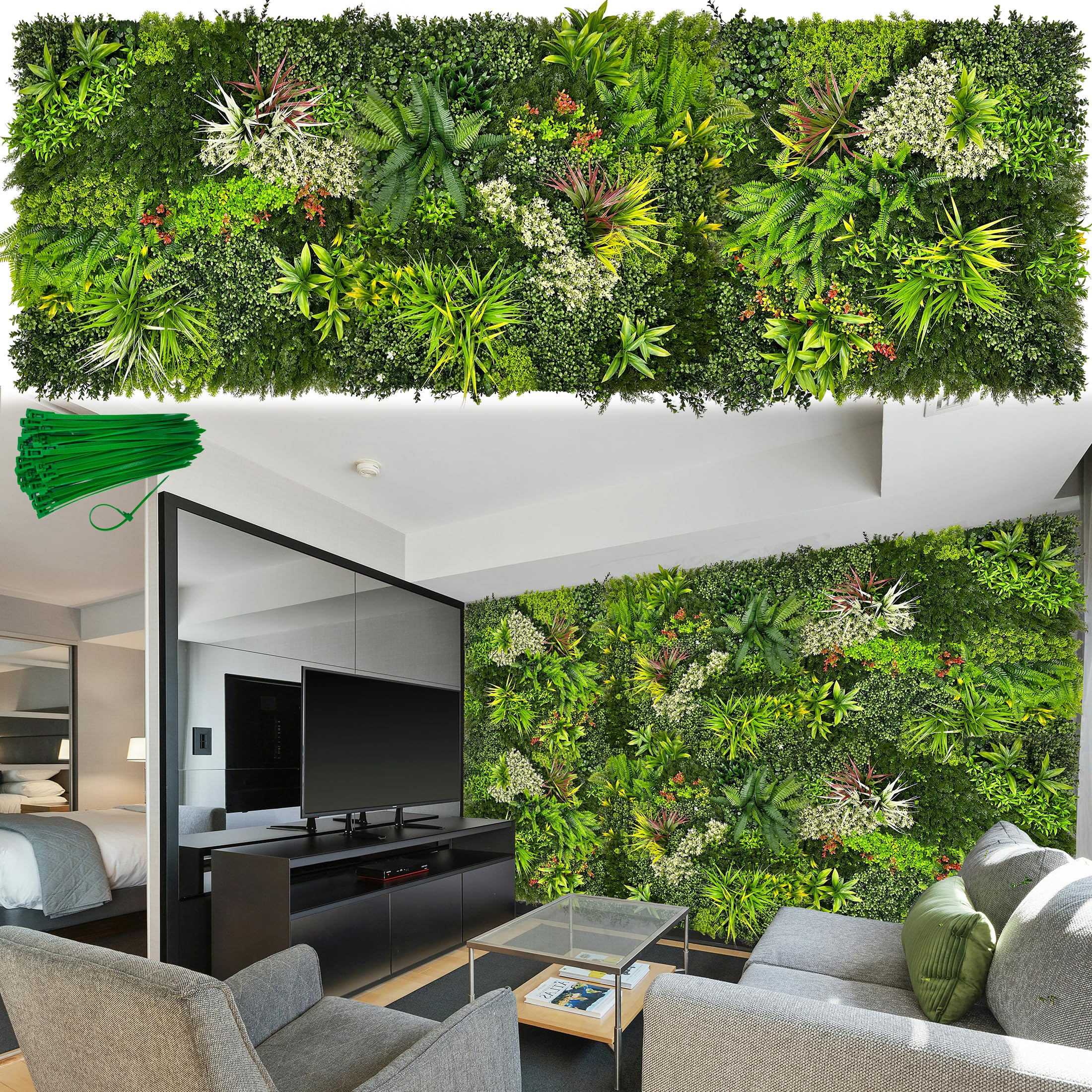 ODTORY Artificial 3D Plant Wall Panels: UV-Anti Faux Grass Wall Backdrop Boxwood Ivy Fence Privacy Screen Fake Greenery Leaf Hedge for Outdoor,Indoor,Garden,Backyard and Home Decor Artificial Boxwood Hedge Panel is 60"×20" , covering an area of 8.4 square feet,The height of the fake leaves is 5 inches, which has a good 3D effect. When the leaves are upright again, they can cover the background well. Unique and beautifully designed, authentic and dense privacy hedge panel.The faux ivy greenery boxwood roll is suitable for indoor and outdoor scenes: can be used as wall decoration, fence privacy, privacy screen.TV wall, balcony, room backdrop, your fence, walls, terrace, garden, courtyard, paths, scenery, interior and exterior or your own creative design for party, wedding, Christmas decoration.Perfect for adding privacy to area.Aesthetic enhance your area with a realistic look to beautify and transform. This boxwood hedge wallboard is made of new PE. Long service life, anti-ultraviolet, and will not fade or wither within 5 years. It is safe to use flame retardant for artificial plant board. No peculiar smell. The faux ivy leaves is firmly connected with the bottom plate and is not easy to fall off. Greenery panels can remain intact even in harsh outdoor environment. This privacy fence is in low-maintenance, long-lasting ! Crafted from new materials, it's built to withstand the test of time, even in the harshest sunlight. No more watering or trimming – it's a money- and labour-saving wonder! And it's easy to install, we provide detailed instructions and 50 zipper tapes so you can easily assemble the faux privacy wall. Each plant panel is equipped with interlocking connectors for easy installation. The bottom plate is flexible and firm, and you can easily cut it with scissors or a utility knife to get the size you want. Due to packaging and transport, the grass wall panels you have received have been over-stressed and may look a little sparse. Don't worry, put it in the sun for 1-3 hours to make the leaves stand up again. This will restore their original beauty. Brushing the leaves with your hands will also help it recover. Please contact us if you have any questions about this green panel.