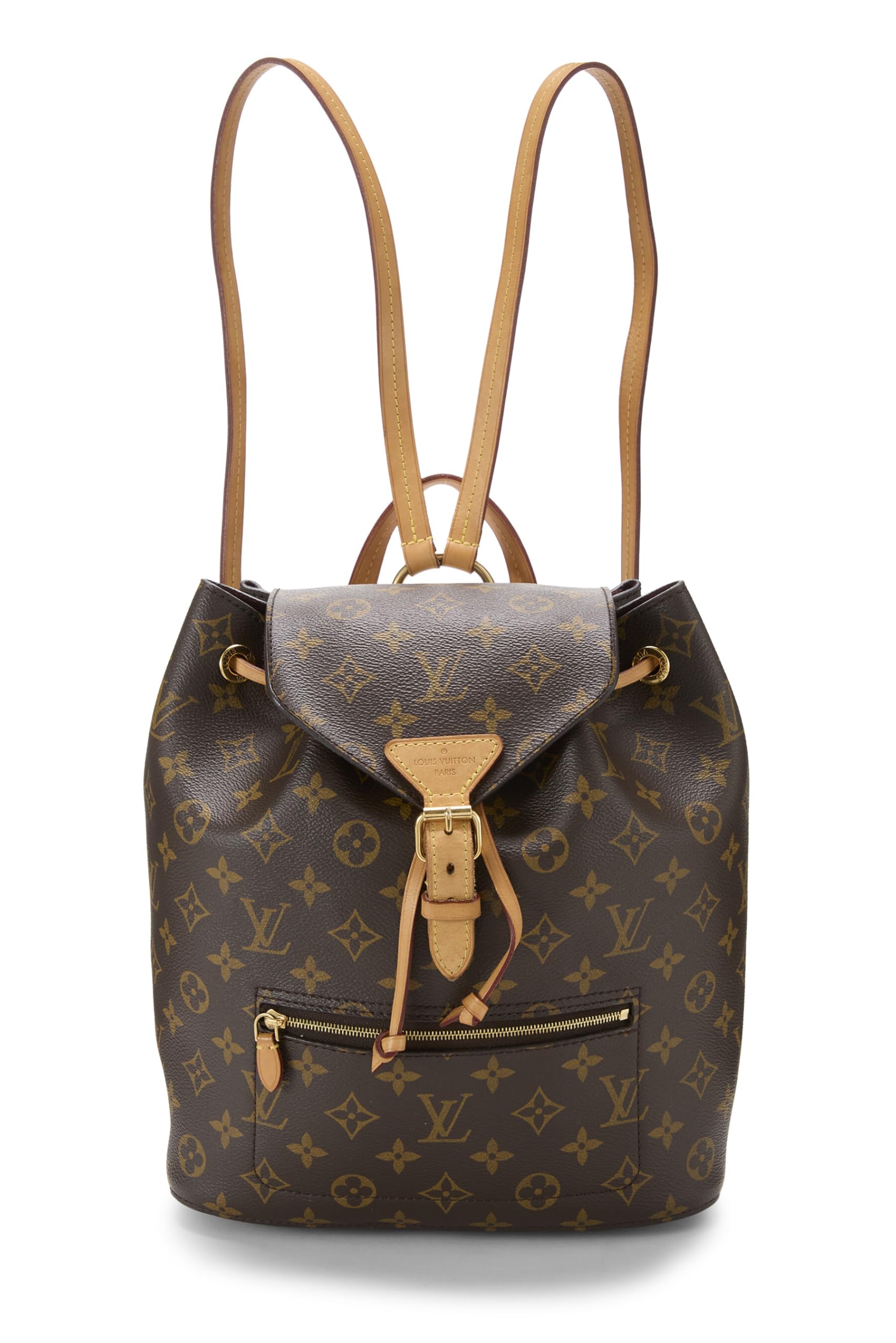 The authentic new model of Louis Vuitton's iconic Montsouris backpack is rendered in Monogram coated canvas, trimmed in natural Vachetta leather, and finished in gold-tone brass hardware. The updated version features a flat zip pocket on the front and a full coated canvas base, versus the Vachetta leather of the previous version. Imported Pre-Loved Condition: Excellent; Faint tarnishing to hardware, even patina to leather trim Length: 10" (25 cm), Height: 11.25" (28 cm), Depth: 4" (10 cm) Made in France Two Adjustable Leather Back Straps Drawstring And Buckle Closures One Slash Pocket Canvas Lining Gold Hardware