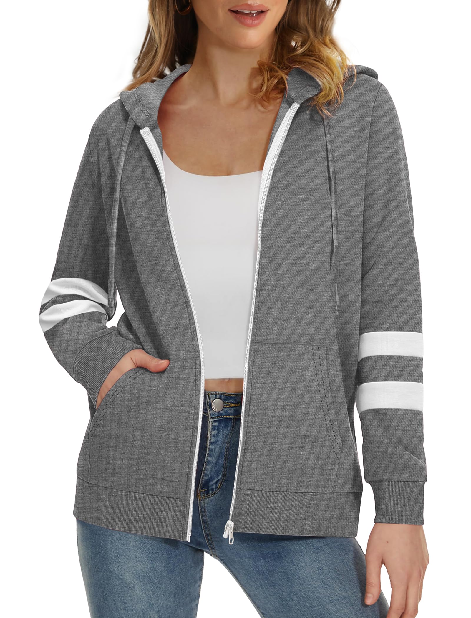 【 Zip Up Hoodie Women】Very in Style Design:Zipper Closure and Pockets, Adjustable Drawstring Hood, Drawstring without metal tips, Color Block on the sleeve--adds a nice little details to the simple hoodies, Full Zip Up Front - suitable for all shapes, Loose Fit, Basic Hooded Sweatshirt. Perfect to Wear in all Seasons. 【Hoodies for Women】Perfect Piece for Your Wardrobe Match:The Casual Lightweight Hoodie is Perfect to zipped up or used as a cardigan match with Tank, Cami, Basic Tees, Jeans, Shorts, Leggings, Pants or Skirt for a Concise Look. Also can Pair this Thermal underwear in Winter. A Must-Have Womens Hoodies in Your Wardrobe. 【zipper sweatshirt women】Occasion:Suitable for Casual Daily/ Home/ Workout/ Sport/ Office/ Travel/ Vacation/ Shopping/ Street/ Party/ Outdoor/ Club to Wear. The Best Gifts for Women. 【Womens Hoodies】Easy to Care:Durable fabric, not easy to pilling. Laundry wash bag can achieve a better function for optimal cleaning, extend garment life. 【Size Note】DO NOT USE Amazon Size Chart which is not ours, please pay attention to check the size info as below "PRODUCT DESCRIPTION”
