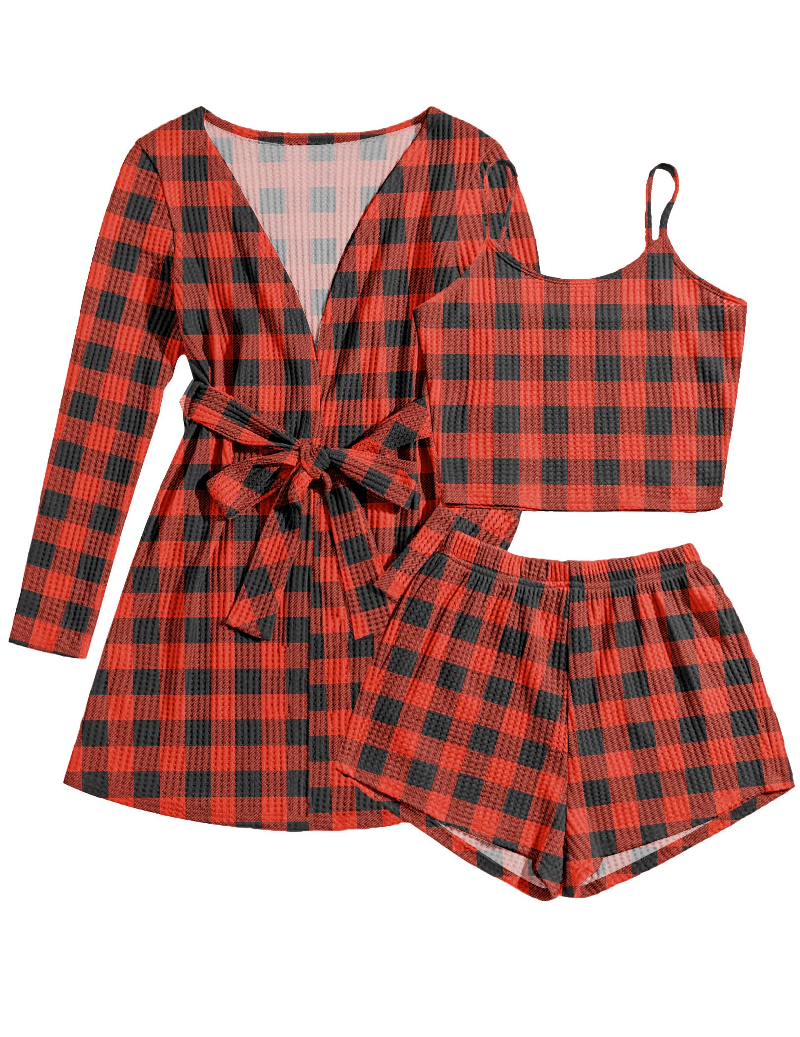 Ekouaer Pajamas for Women Set 3 Piece Lounge Set Soft Pajama Sets Waffle Knit Tank Top and Shorts Cardigan with Pockets S-XXL: XX-Large Black and Red Plaid