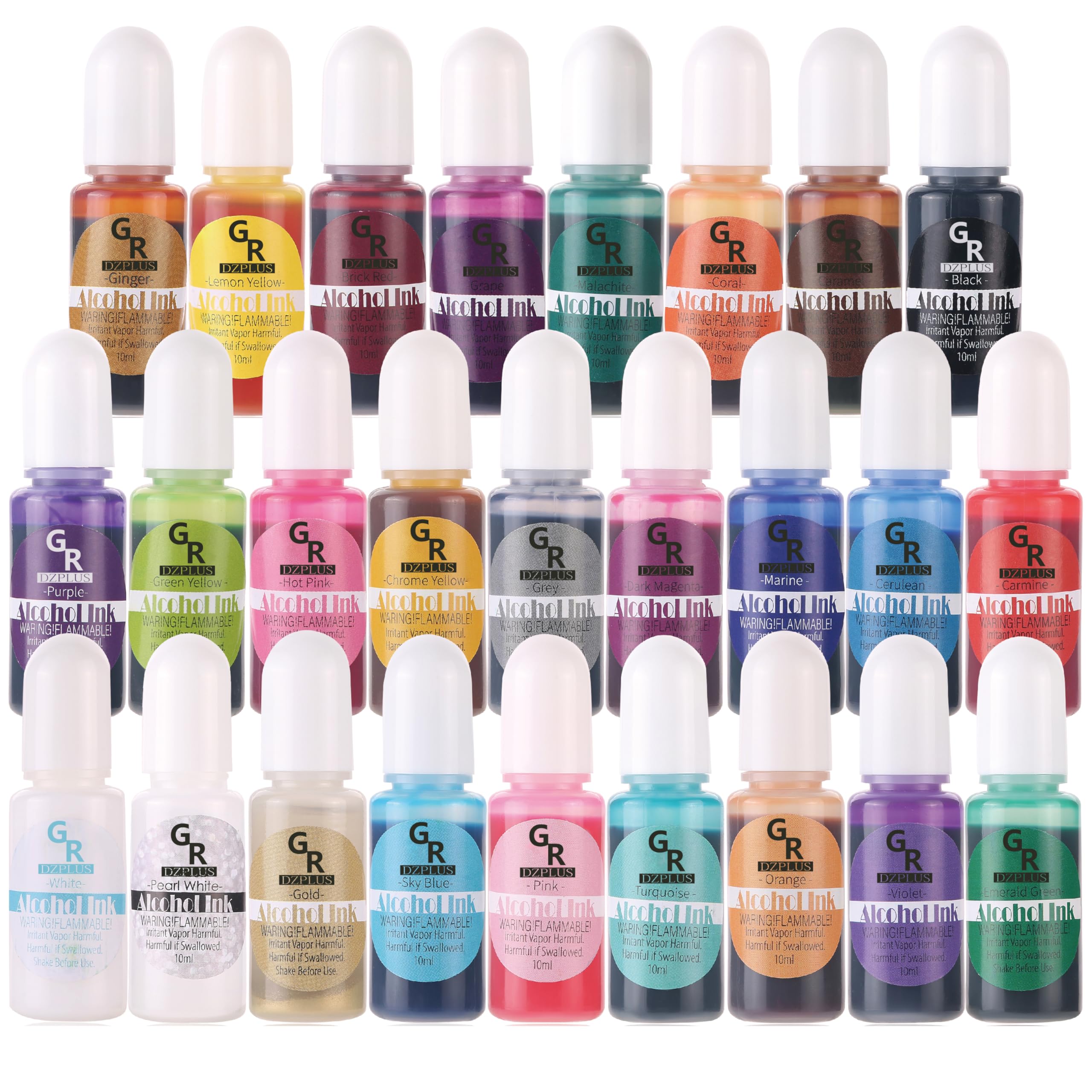 alcohol based marker ink for painting and multi-surface painting.The alcohol inks by GR are dye based, multi-surface alcohol inks. They are acid free, permanent, quick drying and transparent alcohol ink ,Create a vibrant, polished effect on non-porous surfaces such as glossy paper, dominoes, metal, foil, shrink plastic, glass and others Formulated to create a vibrant, polished stone look. This package contains 26 colors alcohol ink set. 26 Colors alcohol ink set 2 bottles of sinking white 24 colors of metallic ink Mixtive ink ,Shake before use 10ml each ,Multi-surface inks