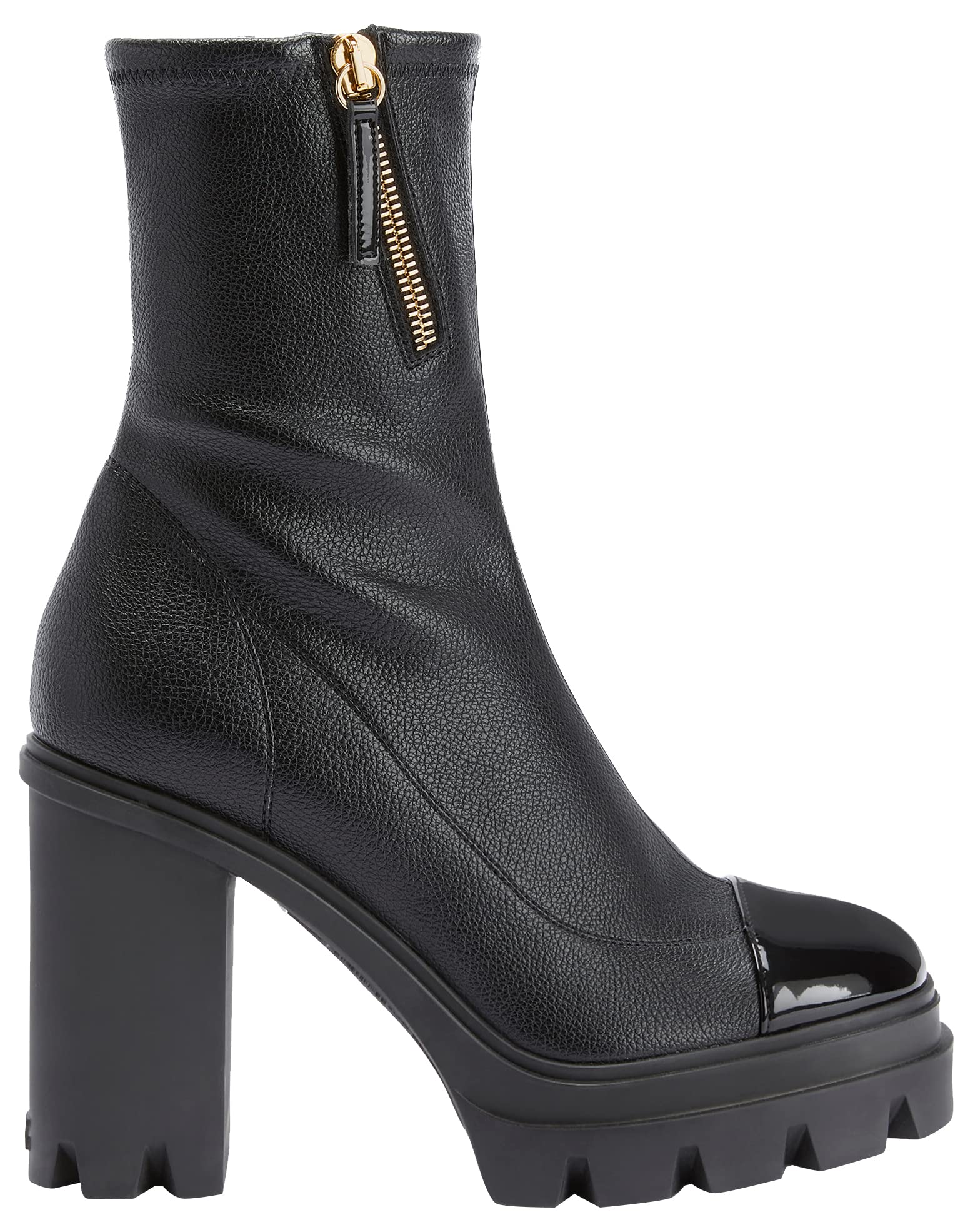 These ankle boots, crafted from leather-effect stretch black synthetic fabric, feature a matching patent-effect toecap, golden metal zippers on the shaft, a black inner side zippers and one-piece black rubber soles with chunky heels. 100% Fabric Imported Crafted from leather-effect stretch black synthetic fabric Golden metal zippers on the shaft Black inner side zippers One-piece black rubber soles with chunky heels Heel height: 110 mm