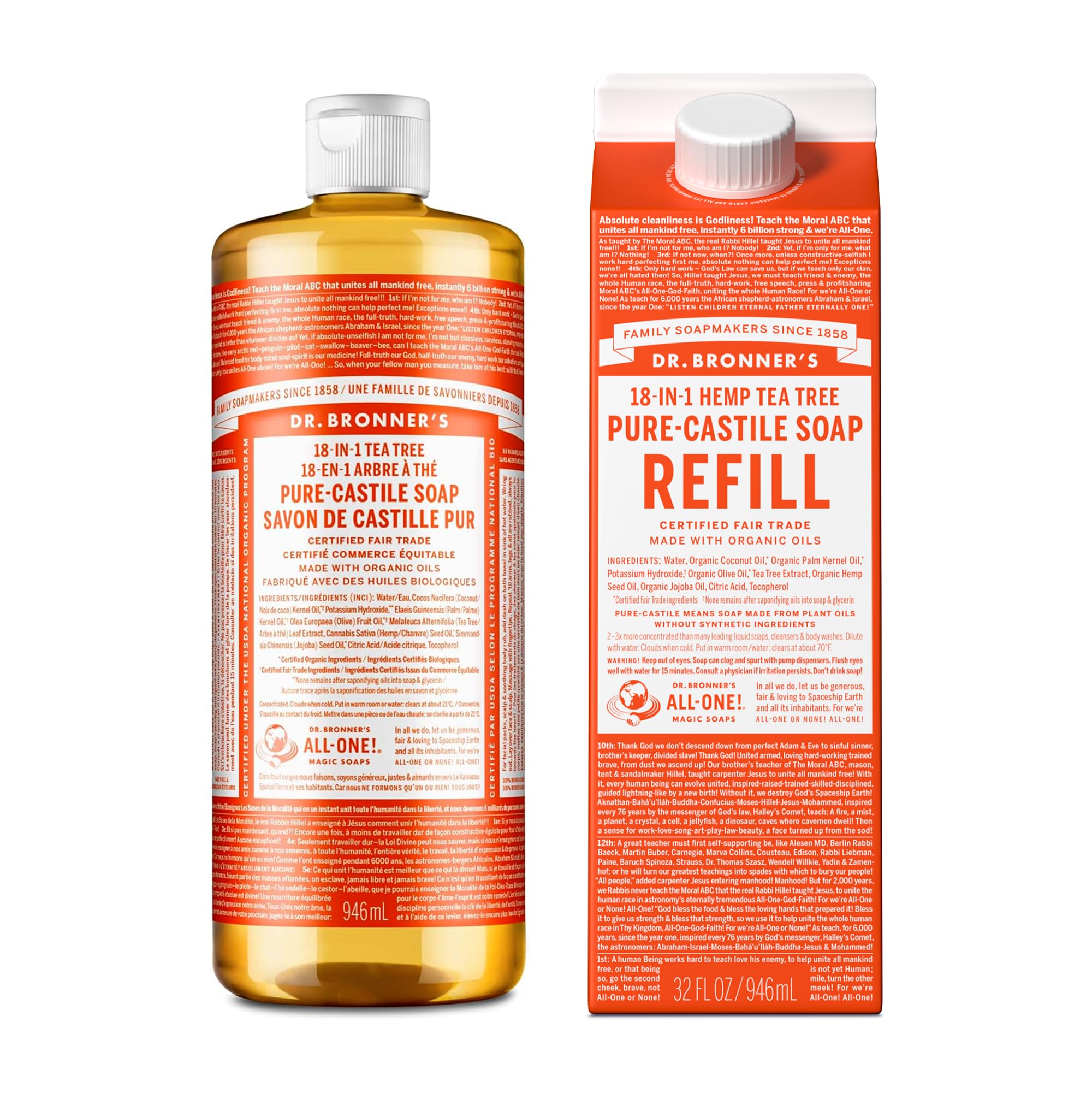 Dr. Bronner's Pure-Castile Liquid Magic Soap Bottle & Refill Carton - Made with Regenerative Organic Certified Oils, 86% Less Plastic per Quart - For Face, Body Wash, Hand Soap Refill- , 32oz: Tea Tree