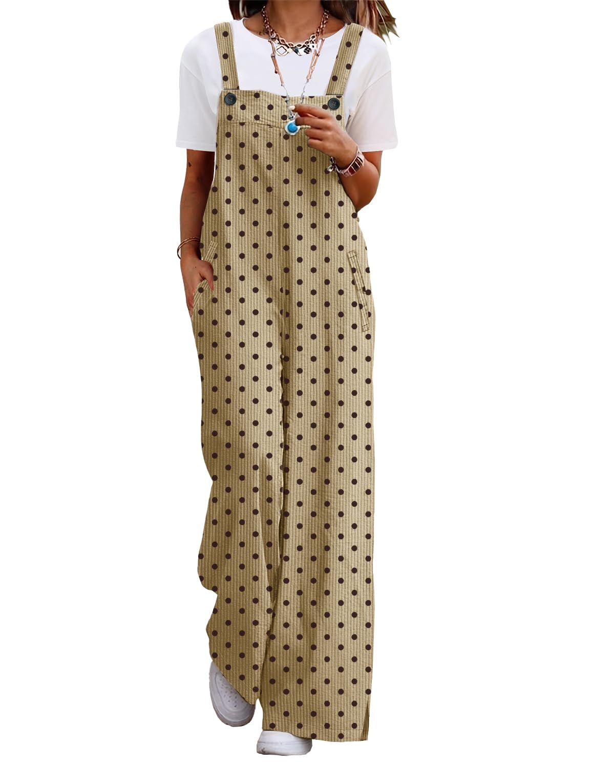YESNO Women's Casual Corduroy Overalls Adjustable Straps Baggy Pants Wide Leg Jumpsuits with Pockets PC2: Large Dot Khaki