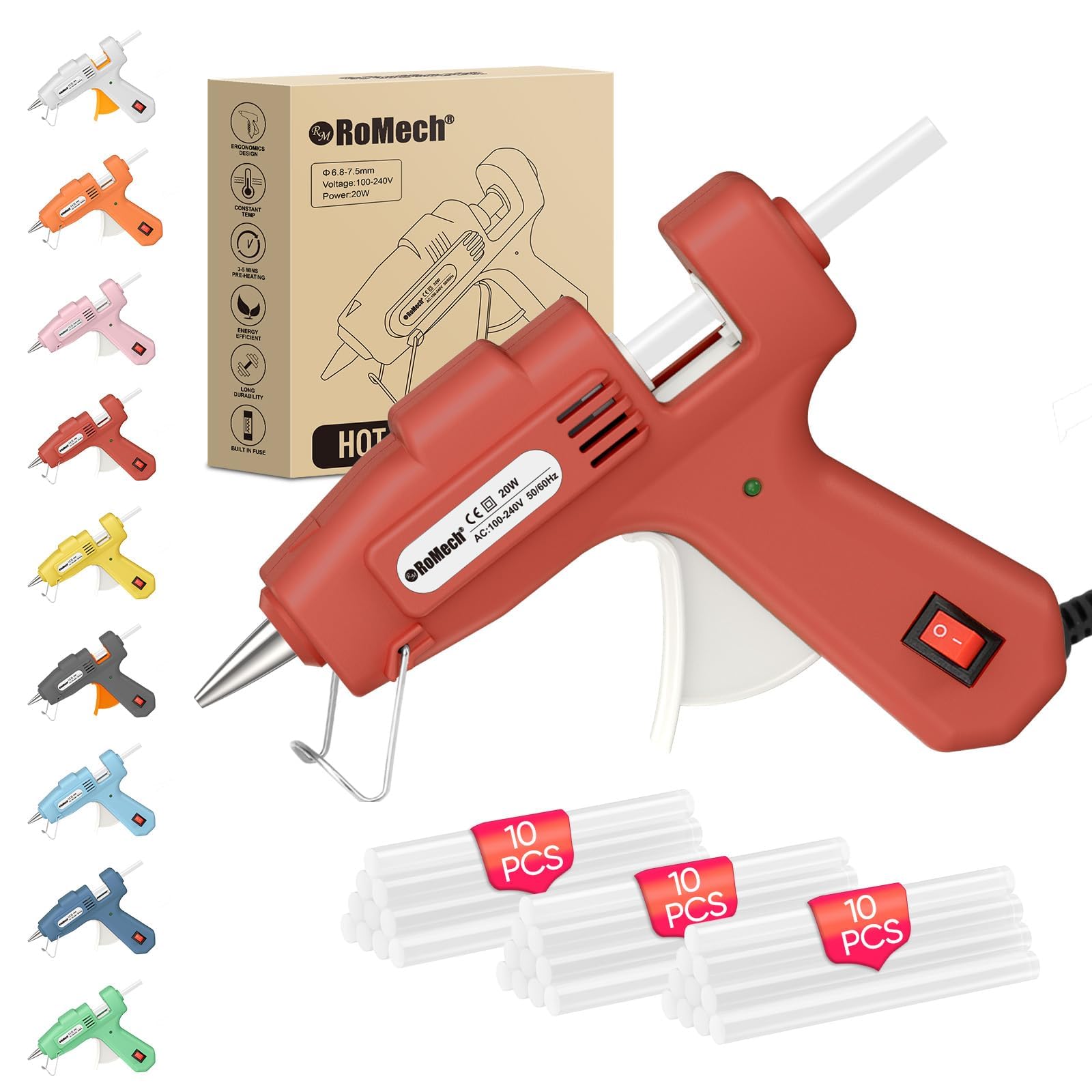 This 20W mini glue gun offers rapid heating in 2-3 minutes and includes 30 glue sticks for immediate crafting or repairs. It features precise control with an ingeniously designed nozzle and squeeze trigger, minimizing glue wastage. With an ergonomic handle and a 4.2ft (1.3m) power cord, the gluegun provides comfortable operation and flexibility across various materials, making it ideal for a wide range of creative projects while ensuring safety with its built-in security fuse. Available in grey, pink, green, blue, white, red, cyan, yellow and orange, 9 vibrant colors to suit your style and preference! [RAPID HEATING & SAFETY] ROMECH Mini glue gun offers quick preheating in just 2-3 minutes and comes bundled with 30 glue sticks (0.28"/7mm diameter), providing an ample supply for your instant crafting or repair needs. The CE-certified hot glue gun has a built-in security fuse that prevents overheating and ensures safe use. [PRECISE CONTROL] With its ingeniously designed nozzle and squeeze trigger, this heavy duty glue gun offers precise application, preventing drips and minimizing glue wastage for a tidy workspace. Available in a variety of vibrant colors to suit your style and preference! [EASY TO USE] The handle is ergonomically designed to ensure comfort even during extended use. The operation is very simple, just insert the glue stick into the hot glue gun, gently press the trigger to preheat for 2-3 minutes, and then release the melted glue. Start your DIY now! [WIDE APPLICATION] Featuring a 4.2ft (1.3m) long power cord, this hot melt glue gun offers greater flexibility for various applications and workspaces. It effectively adheres to a variety of materials, whether it's glass, plastic, fabric, or paper, ensuring powerful adhesion for all your creative projects. The CE-certified hot glue gun has a built-in security fuse that auto-shuts off on short circuit.
