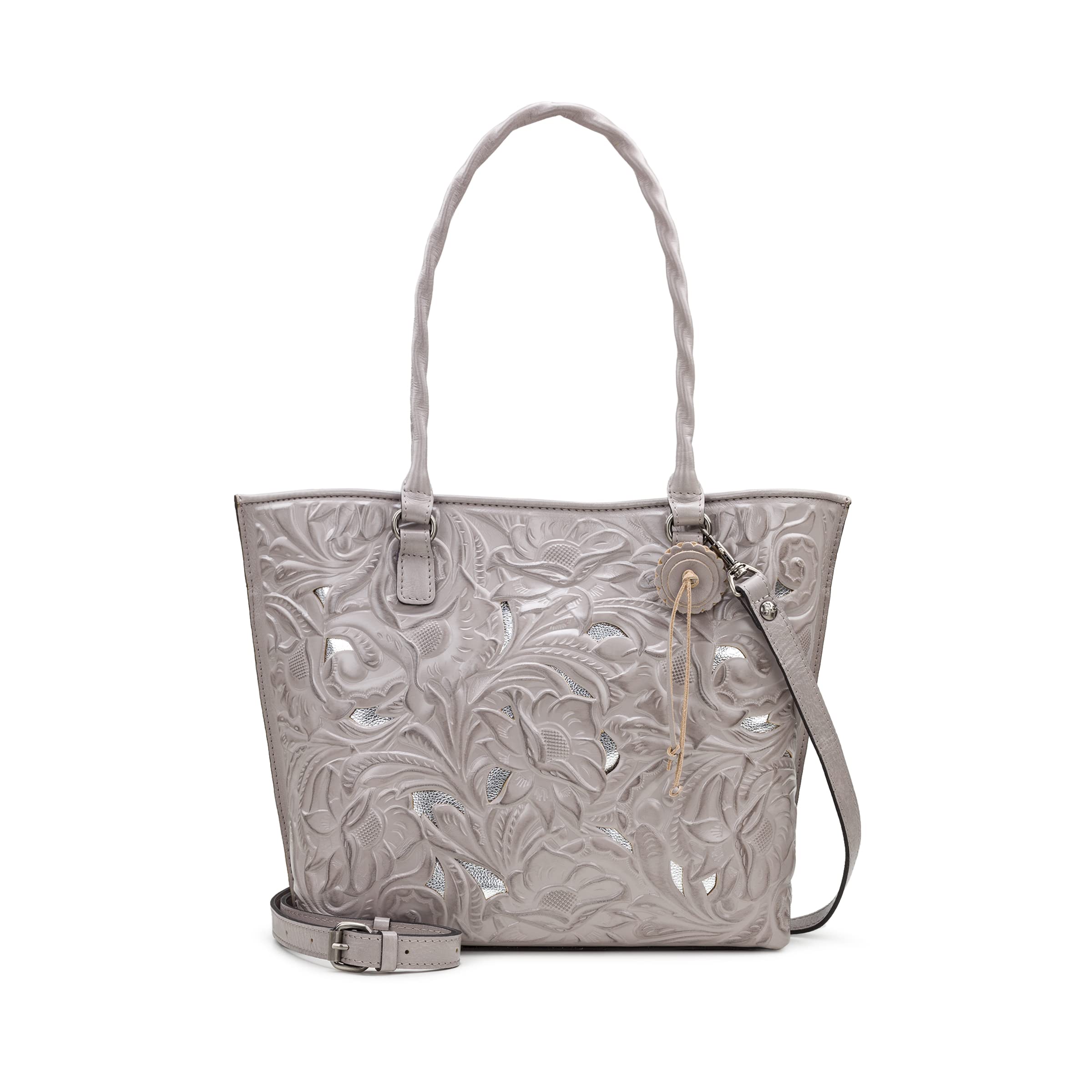 A cutout tooled design in beautifully burnished leather adds sophistication to this practical tote that carries your everyday essentials in style. With a tassel, twisted rope leather handles, and an adjustable/detachable strap, this structured tote is polished and versatile. 100% Full-Grain Leather: Beautifully crafted in luxurious leather, this accessory is a sleek companion for any outfit and just the right size to carry essentials without weighing you down. Features: Magnetic snap closure with signature brushed metal hardware and heavy handcrafted stitching Interior: 1 rear zip pocket, 1 center zip pocket, 2 front slip pockets; faux suede lining made of 100% polyester Exterior: 1 rear zip pocket, deep embossed grape leaf logo, protective metal feet, burned edge finish Care: To ensure your bag stays in everlasting shape; wipe with a warm, damp cloth and allow to air dry. Also included is a dust bag for storage and protection. Dimensions: 16 3/8"(W) x 11 1/2"(H) x 4 3/4"(D). Strap drop: 21" - 24". Handle drop: 10"