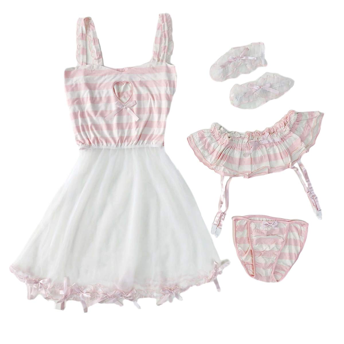 Sexy Cosplay Lingerie for Women Lolita Girls Hollow Out Lace Babydoll See Though Nightdress One Size Lingerie Dress Length 31.88" (81cm) , Bust 30.70"--38.58" (78--98 Cm), Garter Belt Waist 23.62"--39.37"(60--100 Cm), Panties Waist 22.83"--32.28" (58-82cm) Lingerie Color: Pink , Blue Japanese Lolita Kawaii Heart Cut-Out Cute Lace Baby Doll Lingerie Dress Sexy Ladies Pajamas Pink Night Dress Anime Cosplay Costume Design Garter Belts Set Lace Leg Ring Strap Chemise. Babydoll Dress for Women Schoolgirl Cosplay Lingerie is Made of Comfy and Soft Lace See Through Mesh Material, Comfortable To Wear in Sleep Time or Your Special Night. Garter Belt Lingerie Set Feature: Backless Negligee Lingerie, Heart Hollow Out Embroidery and Kawaii Bow on The Chest Lace Chemise, Vintage Pink or Blue White Striped Ruffle Garter Belt , Make You Look Fairy and Elegant. The Sexy Lingerie Set is Suitable for Women, Ladies, School Girl, Teen Girls in Lingerie Party, Sexy Cosplay, Roleplay, Role Playing, Underwear, Sleepwear, Pajamas set Wear To Bed As A Nightgown, Pajamas Set , Nightwear, Lingerie for Women, Sexy Sleep Dress or Photograph Clothing. Package Content: 1 X Women Lingerie Babydoll, 1 X Panties,1 X Garter Belt, 2 X Lace Leg Ring.Lingerie Dress Length 31.88" (81cm) , Bust 30.70"--38.58" (78--98 Cm), Garter Belt Waist 23.62"--39.37" (60--100 Cm),Panties Waist 22.83"--32.28" (58-82cm)