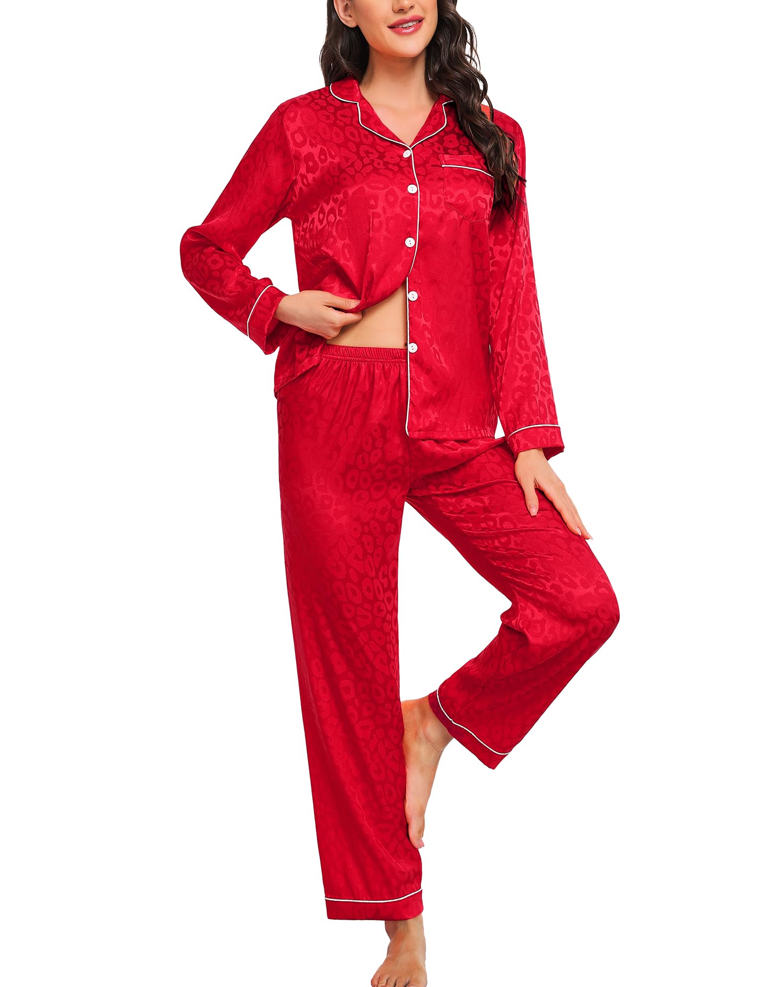 SWOMOG Womens Silk Satin Pajamas Set Long Sleeve Button Down Sleepwear 2 Piece Lounge Set Pj Set XS-3XL: Red Leopard X-Large