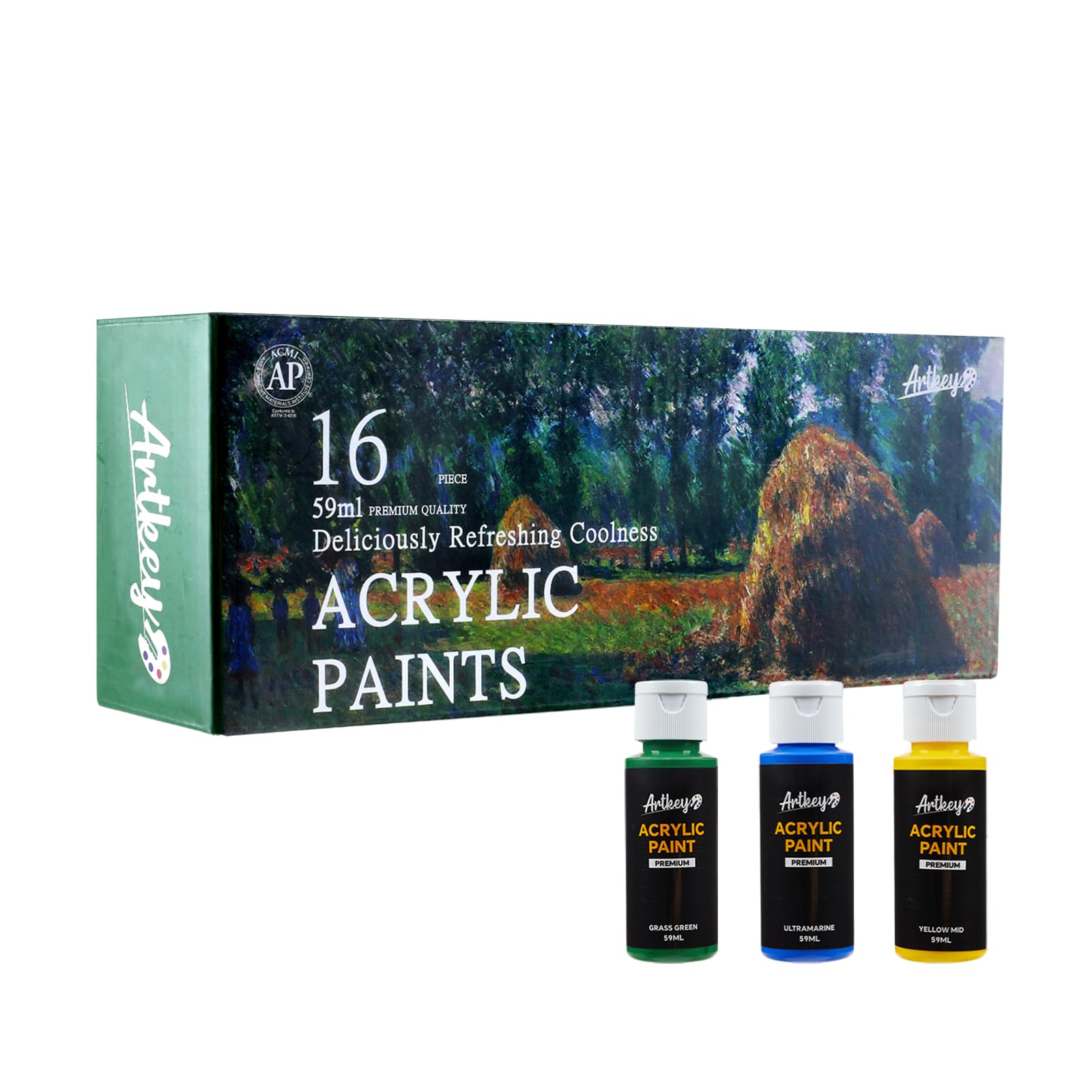 Artkey Acrylic Paint Set - 24 colors 2oz/59ml Acrylic Paints Professional Artists Painting Kit for Canvases Fabric Rock Leather Easter Egg Wood Ceramic Glass Art Craft Painting 24 Bottles Vibrant Acrylic Paints: Professional artist quality acrylic paint, glide smoothly over the surface and provide strong coverage in both large areas and fine detail. The butter-like consistency allows the paint set to mix easily and dry quickly. The acrylic paint will remain in the artwork for a long time and will not fade Tightly Packed Non-Leaking Bottles: The bottle cap is tightly screwed so that the paint will not leak out or dry out from exposure to the air before opening. Each bottle is marked with a color name for easy identification. All you need to do is unscrew the lid to show off your creativity. Remember to tighten the lid when you are done using it Safe & Non-Toxic Acrylic Paints: The acrylic paint set is certified safe and non-toxic for people or pets. Water-based paints allow artists to stay safe while painting without having to interrupt their work for fear of toxicity. Simply clean up with soap and water when you have finished your work Wide Range of Application: Acrylic paint set is suitable for painting on most surfaces such as canvases, fabric, wood, ceramic, rock, metal, plastic, plaster, etc. You can DIY your own canvas art, scrapbooking, crafts, Christmas decorations, Halloween makeup, Easter egg and more with this acrylic paint kit What You Get: The acrylic painting kit comes with 24 bottles of acrylic paint. Packaged in a beautiful and sturdy colorful box. An ideal gift for kids, adults, art lovers, amateurs, beginners and professional artists