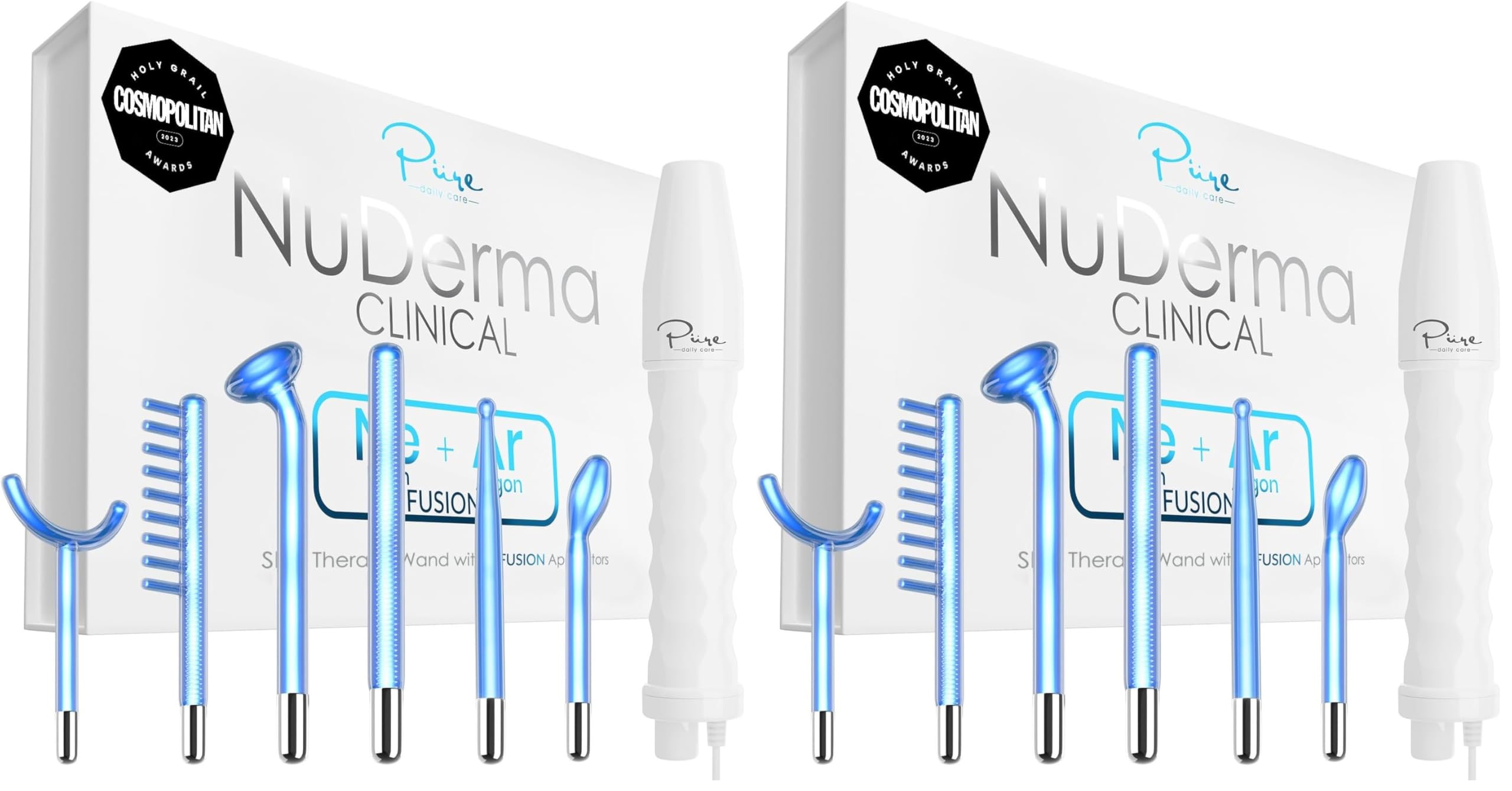 BREAKTHROUGH FUSION APPLICATORS – The ultimate NuDerma system. Our clinical-grade system features a more powerful NuDerma wand and new FUSION Neon-Argon applicators. The 6 FUSION applicators provide the skin boosting benefits of Neon and Argon in one universal delivery system. They work synergistically to offer the complete spectrum of skin therapies while shortening the duration of treatment and the need to switch between individual Neon and Argon wands. Breakthrough Fusion Applicators – Winner of Cosmopolitan 2023 "Holy Grail" Awards. The ultimate NuDerma system. Our clinical-grade system features a more powerful NuDerma wand and revolutionary FUSION Neon+Argon applicators. The 6 FUSION applicators provide the skin boosting anti-aging benefits of Neon and skin-balancing power of Argon in one universal delivery system. They work synergistically to create beautiful radiant skin while shortening treatment duration Instant Skin Radiance – NuDerma treatments are a safe and 100% natural way of boosting your entire skin profile no matter your skin type. Nuderma Clinical turns back the clock by energizing and oxygenating skin at the cellular level. It also balances the skin ensure a smoother-looking complexion up to 90% faster. You’ll see a difference after just a single session. Better Absorption of Your Beauty Serums and Creams – Your preferred beauty creams and serums are expensive. NuDerma ensures that you are getting their maximum effects by improving your skins receptiveness to absorption. Use your preferred serums or creams immediately after NuDerma Sessions to ensure maximum absorption into the deeper layers of your skin; boosting their effects by up to 5x. Specialized Applicators for Total Body Sessions- NuDerma Clinical features specialized glass applicators like a Y-shaped wand that can conveniently be applied to areas like your arms and neck or a Rod applicator that works with broader areas like belly and back. A supercharged comb wand is perfect to energize the scalp and hair. What's Included – 1 NuDerma Clinical Device, FUSION powered mushroom wand, FUSION powered Y-shape wand, FUSION powered comb wand with Tungsten, FUSION powered tongue wand, FUSION powered bent wand, FUSION powered rod wand with Tungsten, quick-start treatment guides, instruction and support contact manuals. A brand proudly based in the United States.