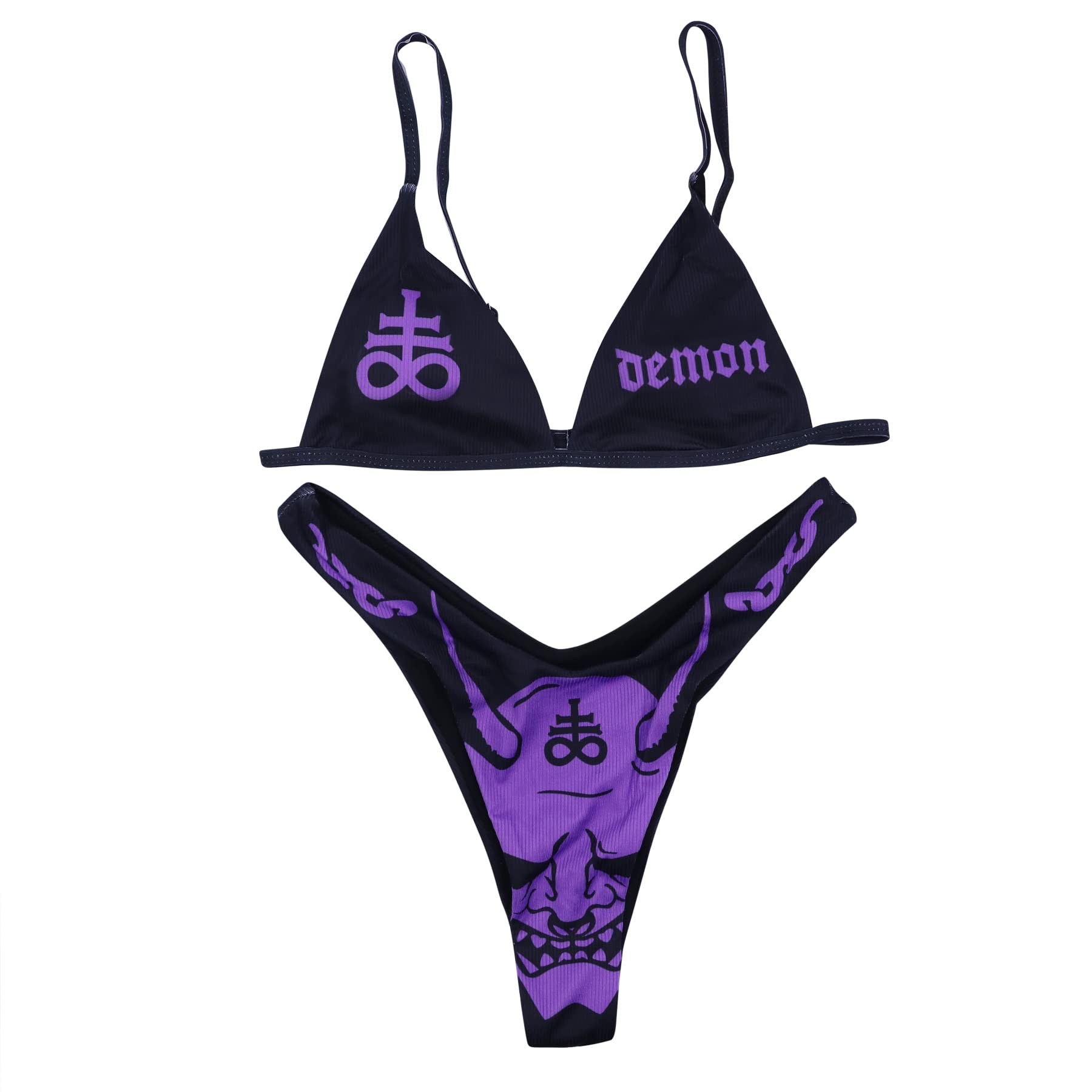 ANKOMINA Women Gothic Skull Letter Printed Two Piece Swimsuit High Cut Triangle Bikini Set for Rave Party Festival Halloween: Medium Black E