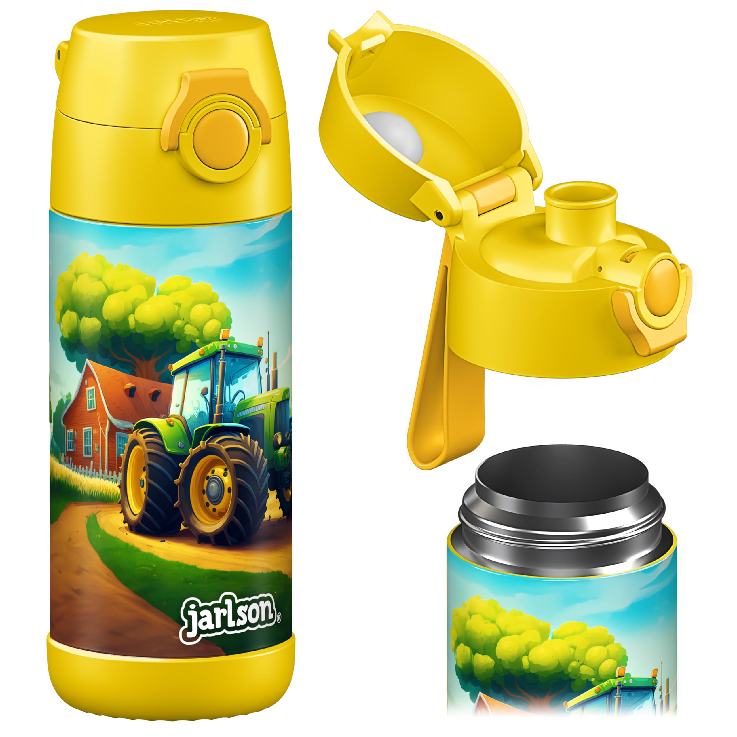 Invest in the JARLSON water bottle for a safe and healthy solution to your child's hydration needs. Made with BPA-free, phthalate-free, and food-grade stainless steel, it guarantees your child is drinking from a clean and safe source. The bottle is easy to clean and maintains temperature for hours, with a convenient push-button lid and a chug for effortless drinking. Meeting the highest safety standards, it is suitable for both boys and girls. SAFE and HEALTHY: Rest easy knowing that your child is drinking from a bottle that's BPA-free, phthalate-free, and made of food-grade 304 stainless steel, a trusted material in the food industry. EFFORTLESS CLEANING: The JARLSON water bottle is simple to clean by hand or in the dishwasher. Its design makes it easy to reach all areas, so there's no worry about pesky residue hiding in corners or grooves. VACUUM INSULATION: With its vacuum insulation, your child's drink will stay at the desired temperature for hours. Keeps cold drinks cold for up to 12 hours and warm drinks warm for up to 6 hours. USER FRIENDLY: The push-button lid with the chug makes drinking easy and enjoyable for your child. Perfect for school, sports, swimming, or cycling. The 12 oz and 18 oz sizes are perfect for kids and suitable for both boys and girls. SPARE PARTS AVAILABILITY: Enjoy a lifetime of hassle-free sipping with our durable drinking bottle. In the possible event of wear and tear, rest assured that we've got you covered with our comprehensive range of spare parts. Save money and eliminate worries with our top-notch product that's built to last.
