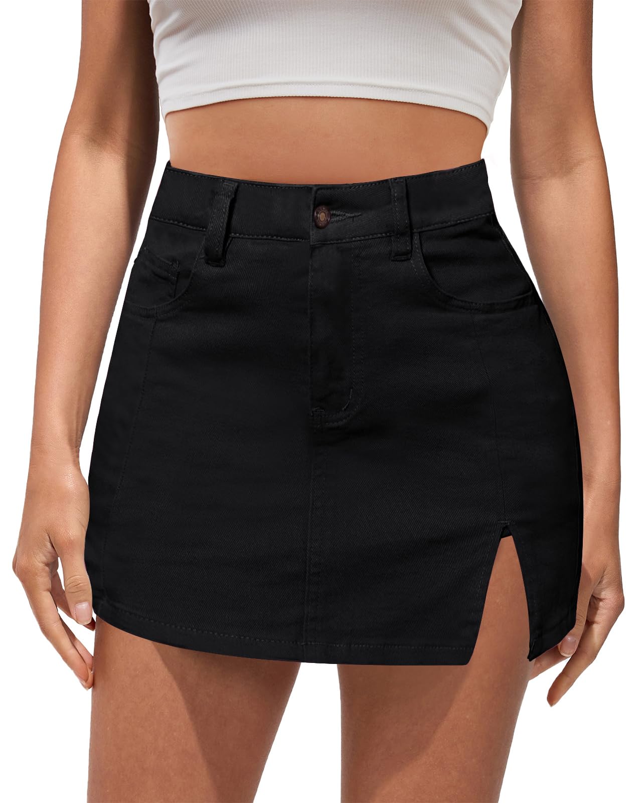 Vetinee Jean Skorts for Woman High Waisted Trendy Slit Stretchy Denim Skirt with Shorts Y2K Casual Summer Skorts Skirts: Medium True Black