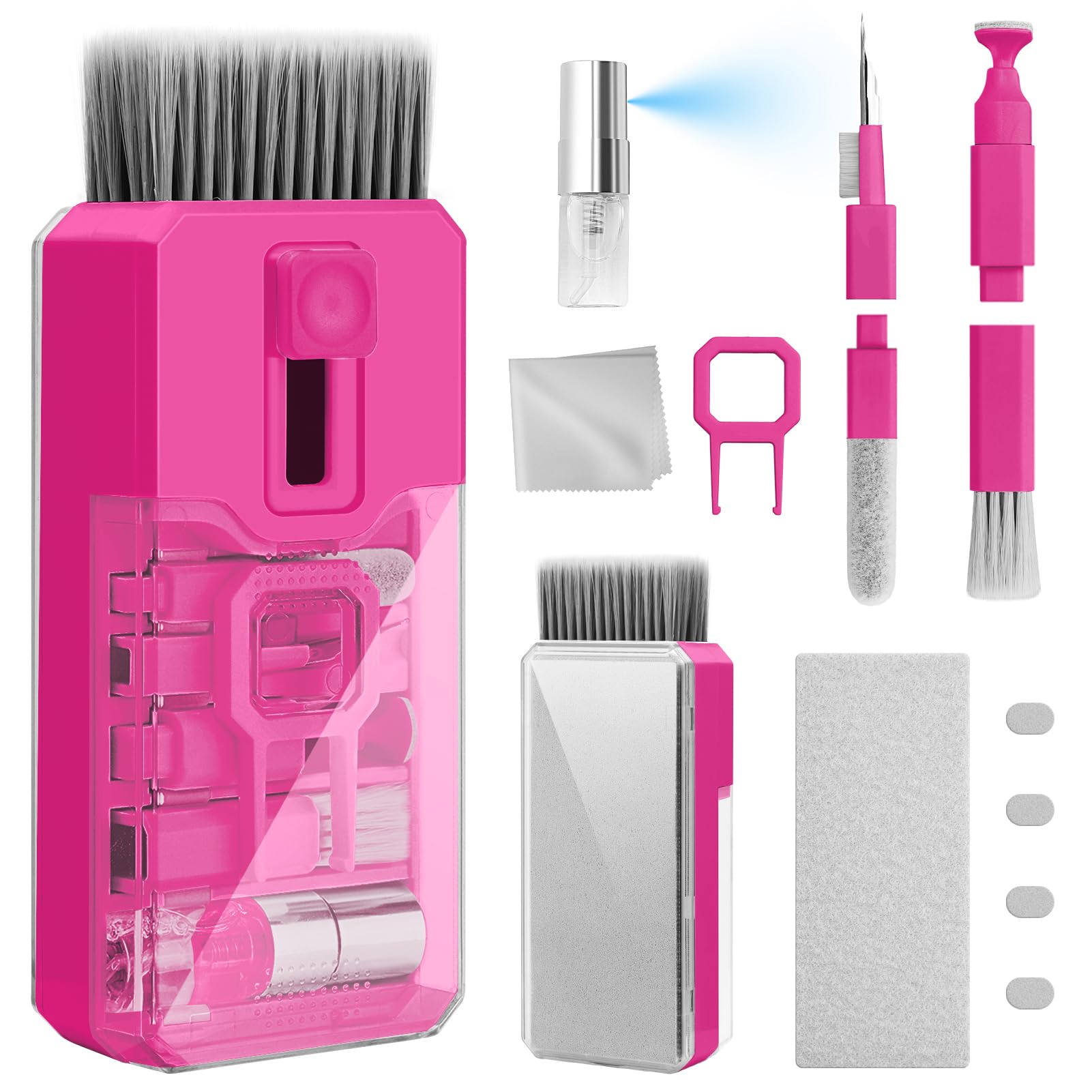 Improved screen cleaning tool. Wipe with the 2mm thick widened polishing cleaning cloth at right angle to better fit the screen corners of computers. The keyboard cleaning kit effectively absorbs stubborn stains, leaves no discolouration, no streaks and no fibre loss on the screens. High-quality microfibre cloths are extremely soft and durable. With an affordable screen cleaner kit, you no longer risk scratching the screen of your expensive new phone or laptop 【UPGRADED LAPTOP CLEANING KIT 】 The macbook cleaning kit computer screen cleaner comes with a number of accessories including a retractable large brush, polishing cleaning cloth X 2, keycap puller, metal pen tip, flocking sponge, thin soft brush, soft plastic lens cleaning pen, 5 replacing cloth, large cleaning microfiber cloth. You deserve the comprehensive computer cleaning kit keyboard vacuum at a low cost 【PROFESSIONAL KEYBOARD CLEANING KIT】 The laptop screen cleaner keyboard cleaner can pull out the keycaps of gaming keyboards and mechanical keyboards. A retractable keyboard brush works on laptops and keyboards, while the mini high-density brush is great for deep cleaning between keys for cleaning between flatter keys on a laptop, the metal pin tip gently removes any stains. This electronic cleaning kit macbook cleaner totally meets professional cleaning needs 【OFFICE DESK ACCESSORIES】This keyboard cleaner kit is easy to use and can clean your keyboard and electronic screen with just one swipe. Wiping with the 2mm thicken widen polishing cleaning cloth designed at a right angle for better fitting screen corners of computers with our recyclable cleaning spray, The laptop cleaner kit for macbook effectively absorbs stubborn stains, leaves no discoloration, no streaks, and no fiber shedding on the screens 【MULTIFUNCTIONAL TOOLS 】Mini soft brush and soft plastic lens cleaning pen are specially designed for DSLR camera screen, lens, and other delicate surfaces. 5 more cleaning cloths of it supplied for replacement. The flocking sponge is an excellent tool for cleaning earbuds charging cases, And the earbud cleaning kit is ideal. This electronic cleaner tool is equivalent to 10 other electronic cleaning kit 【PORTABLE DESIGN & PERFECT TOOL】 The office supplies is compact in design, easy to carry, and you can easily take it anywhere. It's perfect to keep one in a drawer, one in your car, or in your bag. It is easy to use and can clean your keyboard and electronic screen with just one swipe. Is the perfect cleaning tool for your friends and family