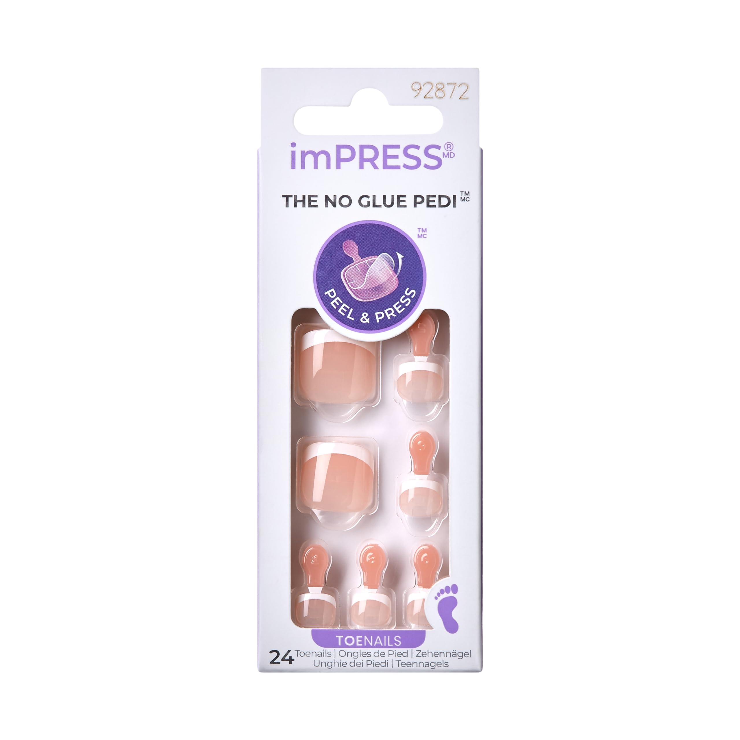 Hot trend alert! The matching No Glue Pedis & pedis by imPRESS are the must-haves for this season. Elevate your look with these press-ons anytime, anywhere. With Patented Super Hold adhesive, the nails can last up to 7 days. Just peel, press & go! These false toenails come ready to wear, no polish or glue needed! Just Press On & GO! NEW PureFit Technology makes the toenails super slim and super comfortable. Toenails that look and feel just like your own! The NO GLUE instant pedi that is safe on natural nails The EASIEST pedicure with pre-applied adhesive - just peel, press & go Super Hold adhesive for up to 7-day hold Pedicure kit contains 24 press-on toenails, prep pad, mini nail file, and manicure stick On trend light beige press-on fashion toenails with white French tips are short length & squoval shaped - Pair them with imPRESS French Press-On Manicure 'Model' for a matching mani/pedi