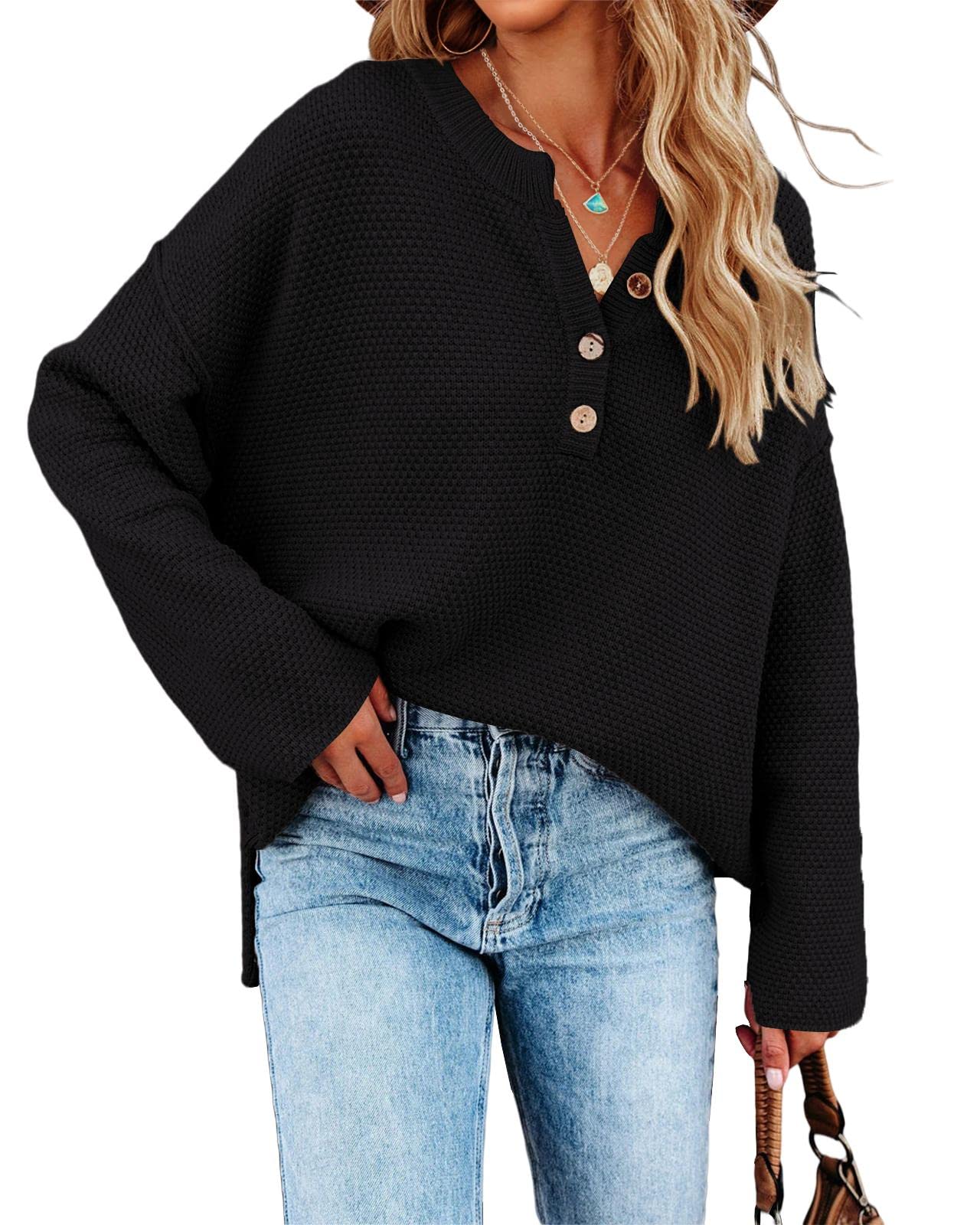 FeaturesV neckOversized slouchy styleBatwing long sleeveDropped shouldersButton up designSide splitPlain sweatersGarment Care1.Both hand and machine washable.2.Do not use bleach. Made of soft, skin-friendly high quality knitted material, cozy to wear. This v neck sweater is perfect for women to wear in cold morning, spring, fall or winter days. Oversized pullover sweaters features: v neck, crew neck, button up, batwing tops for women, womens henley tops, comfy, casual slouchy style, loose fit, side split, drop shoulder, solid plain color knit blouse. Easily pair this plain sweaters with jeans, leggings or skinnies to get a casual, modest and trendy look. Special button design make this batwing sweaters different and chic. Open more buttons if you want to get a sexy look. This knitted henley tops is perfect for any occasions, like party, vacation, street, school, dating, club, office, work or daily wear. Hand wash or machine wash, do not bleach. Fit from S to XL.