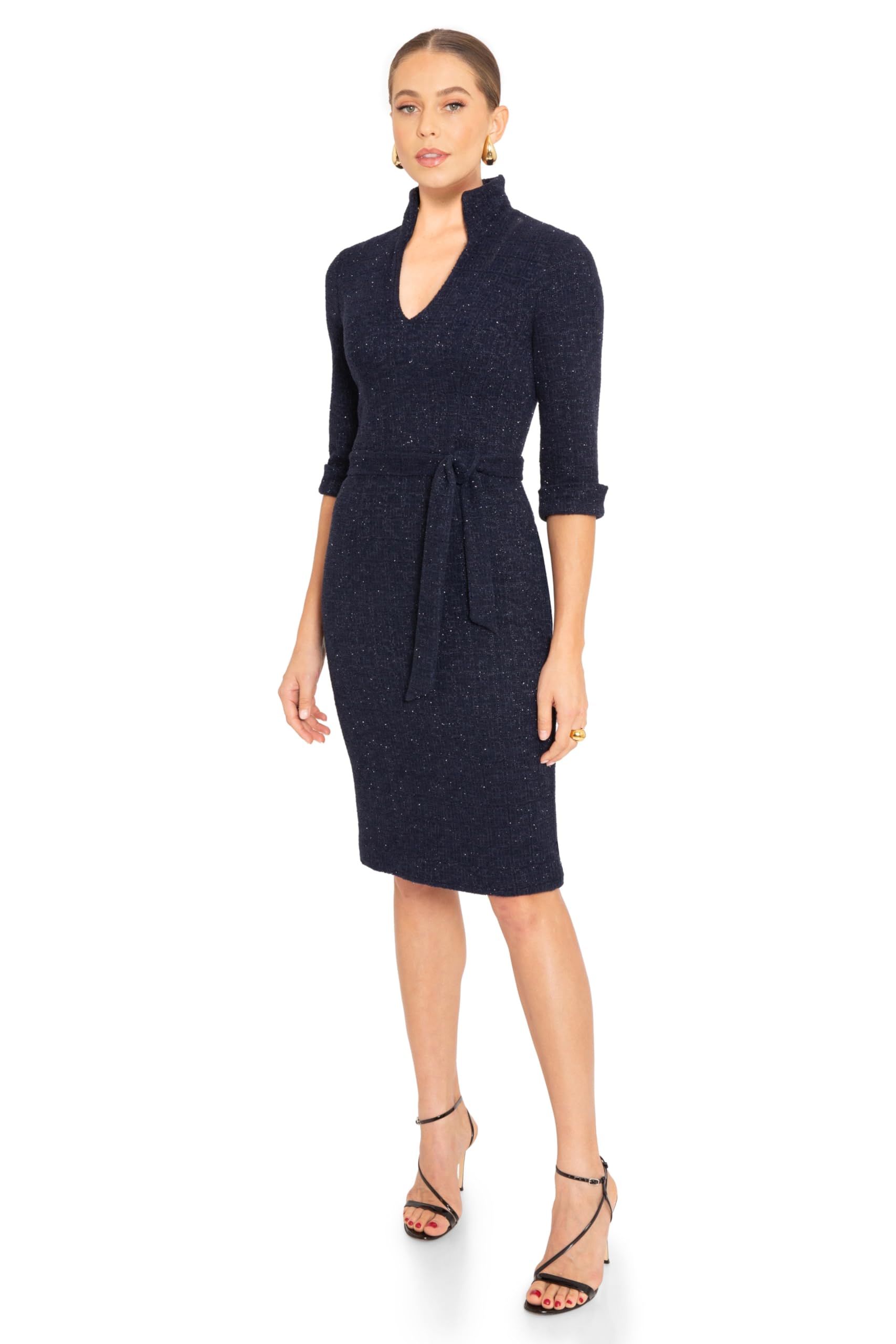 Made of our double face viscose blend, the Madeline sheath offers a chic look for day and night. The top features a soft v-neckline with a modern take on a stand up collar, 3/4 cuff sleeves, self tie at waist, and fitted sheath skirt. Dress is fully lined with a center back hidden zipper. Runs true to size., Cut with a slim fit and a knee length. Viscose-blend fabric has a smooth feel and offers moderate stretch. Lining: 96% polyamide/4% elastane Fabric: Mid-weight stretch suiting Optional self-belt, Stand up collar Lined