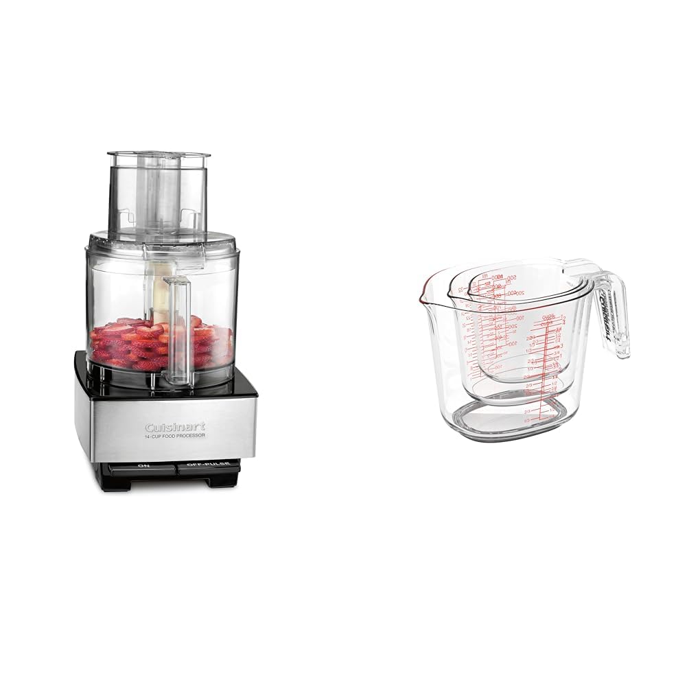 The Cuisinart Food Processor makes cooking for crowds fast and easy. Made from brushed stainless steel, this sleek kitchen appliance workhorse is a breeze to use and whips through prep and cooking with ease. Whether making a weeknight meal or a weekend celebration, the 14-cup vegetable chopper, blender, and food processer in one features a work bowl to hold everything as the powerful 720-watt motor makes quick work chopping fruits and vegetables, shredding cheese, or kneading dough. The large food tube of this electric food chopper precisely slices and shreds whole fruits and vegetables for kitchen-efficient convenience. The Cuisinart 14-cup food processor includes a 4mm stainless steel medium slicing disc, stainless steel shredding disc, chopping/mixing blade, and 36-inch cord. For added convenience, it also includes a recipe book. SUPERIOR FUNCTION: The Cuisinart Food Processor with 720-watt motor functions as a vegetable chopper, blender, and food processer in one. Make any kind of dip, puree soup, or sauce including hummus, salsa, guacamole, and more. MUST-HAVE FEATURES: The 14-cup food chopper has “on” and “off/pulse” buttons with an extra-large feed tube with bowl sleeve assembly designed for both small and large feed tube pushers. It also comes with a detachable disc stem for easy clean up. INCLUDED ACCESSORIES: This food processor comes with dishwasher-safe parts including a stainless steel standard slicing disc (4mm), medium shredding disc, and stainless steel chopping/mixing blade. NOTE TO CONSUMER: The shredding and slicing blades of this electric chopper are not adjustable. Please refer to the manual before setting up. LIMITED 3-YEAR WARRANTY: The Cuisinart Food Processor comes with a limited 3-year warranty on the entire unit and a full 5-year warranty on the motor.