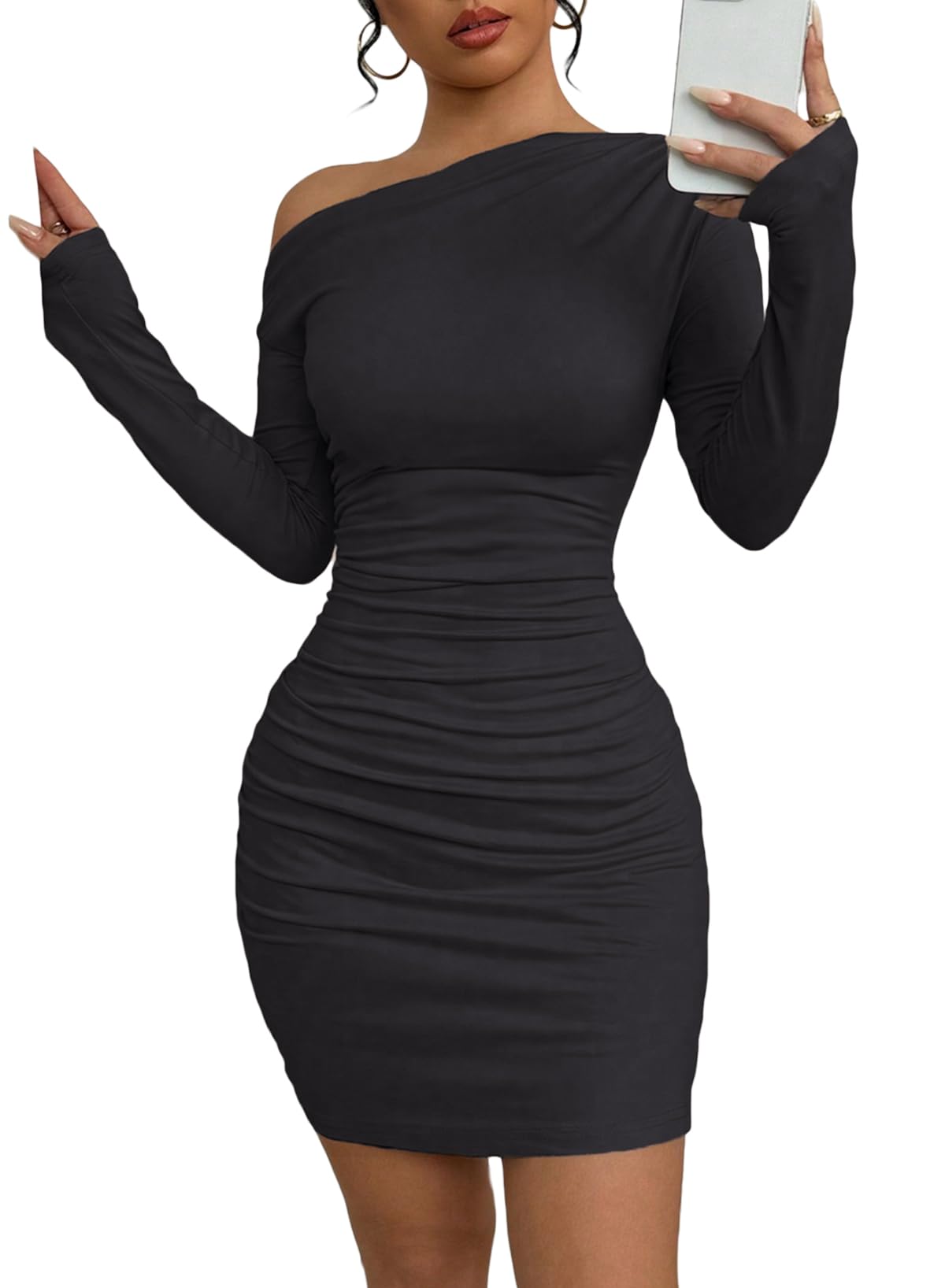 Fabrics:Sexy off the shoulder dresses are very soft and comfortable, skin-friendly, has a elasticity, made of super soft and stretchy fabric, not see through Feature:The long sleeve mini dresses are elegant and fashion, off shoulder detail, slim fitted, tight, ruched design to perfectly embrace all the right places on your body. The classy dresses are a party must-have little black dress Occasion:The ruched bodycon dresses are suitable for party, cocktail, birthday, wedding guest, formal, dating, going out, night out, date night, club, homecoming, evening, dinner, holiday, dating, graduation, daily gathering other special occasion Size:S=US(4-6), M=US(8-10), L=US(12-14), XL=US(16-18), 2XL=US(20-22), sexy off the shoulder dresses perfect for Fall, Winter, Spring. Pair with hand bags, high heels, necklace, earrings and other fashion items Care: Machine Wash/Tumble Dry/No Bleach