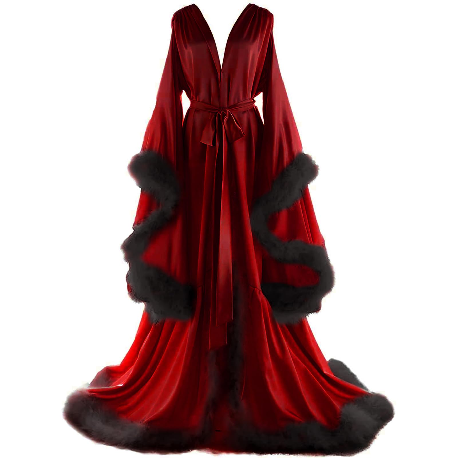 Daily Life MallDaily Life Mall Women's Feather Bridal Robes Old Hollywood Maternity Photoshoot Nightgown Silk Bathrobe Long Lingerie: Small Wine Red+black