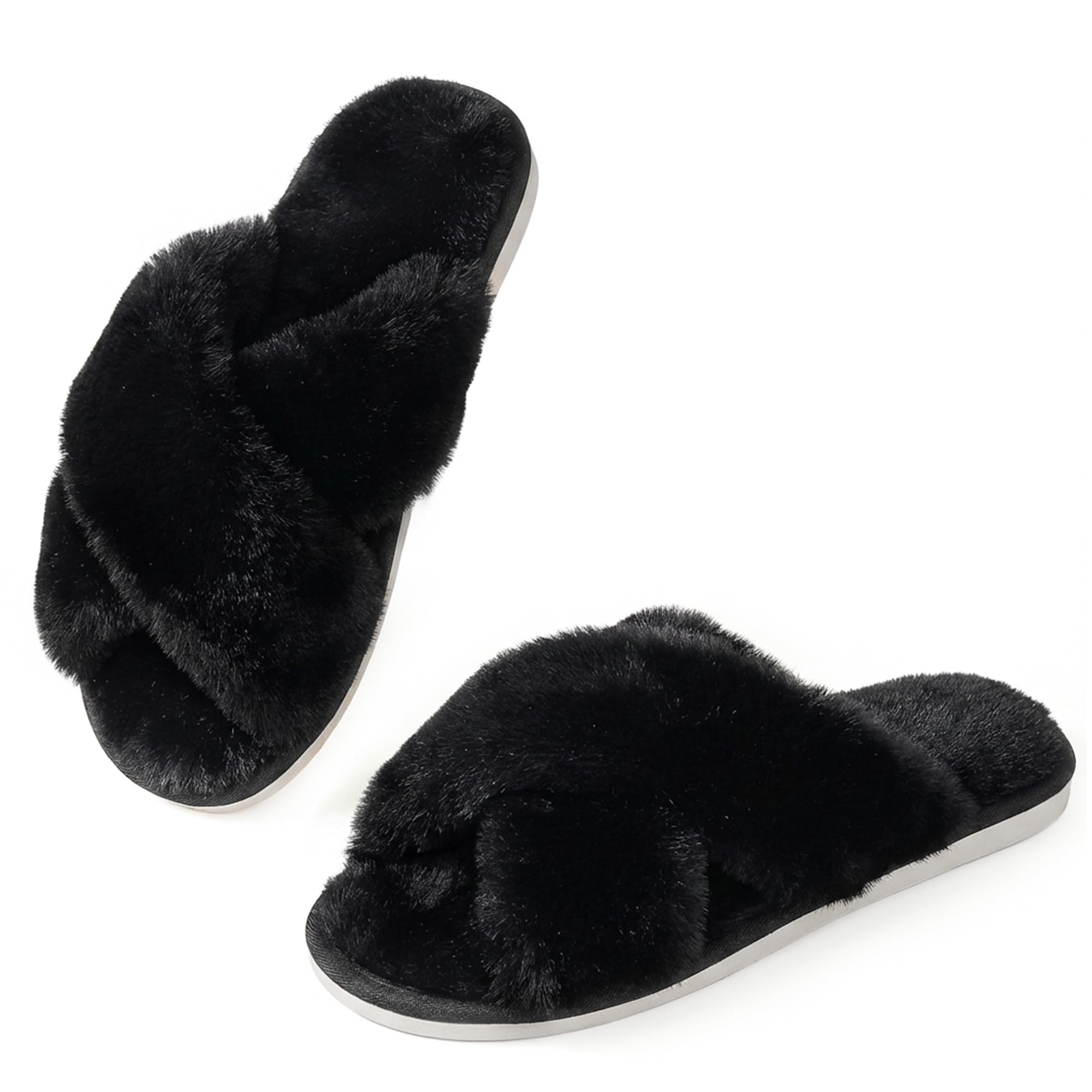AnkisAnkis Womens Fuzzy Slippers Memory Foam Cross Band Cozy House Slippers Plush Home Fluffy Furry Slippers Open Toe Cute Soft Ladies Indoor Outdoor Slipper Slides Wedding Bride Shoes Gifts: 9-10 Black