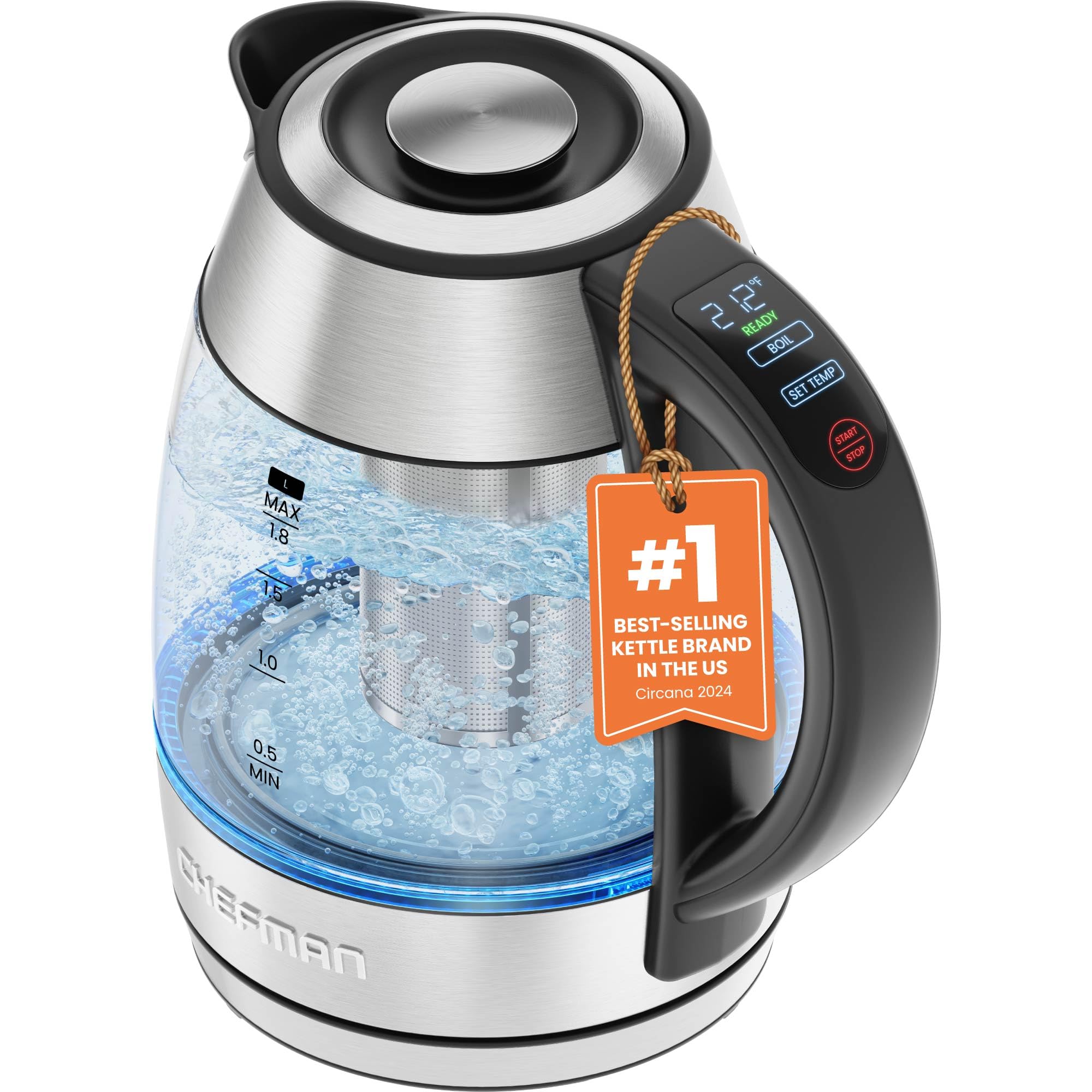 ChefmanChefman Electric Kettle with Temperature Control, 5 Presets LED Indicator Lights, Removable Tea Infuser, Glass Tea Kettle & Hot Water Boiler, 360° Swivel Base, BPA Free, Stainless Steel, 1.8 Liters: 1.8L - Stainless Steel - Tea Infuser - Temperature Control