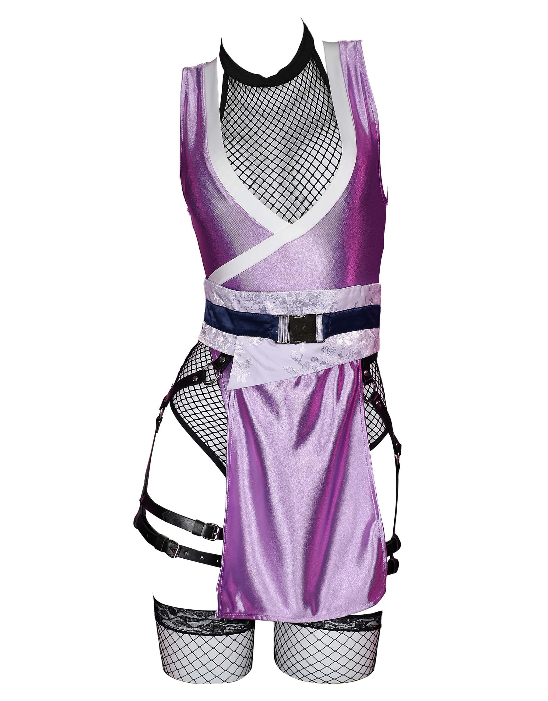 MobbunnyMobbunny Womens Anime Cosplay Costume Purple High Slit Bodysuit Fishnet Mesh Bodysuit with Mask and Thigh Socks: Small Purple