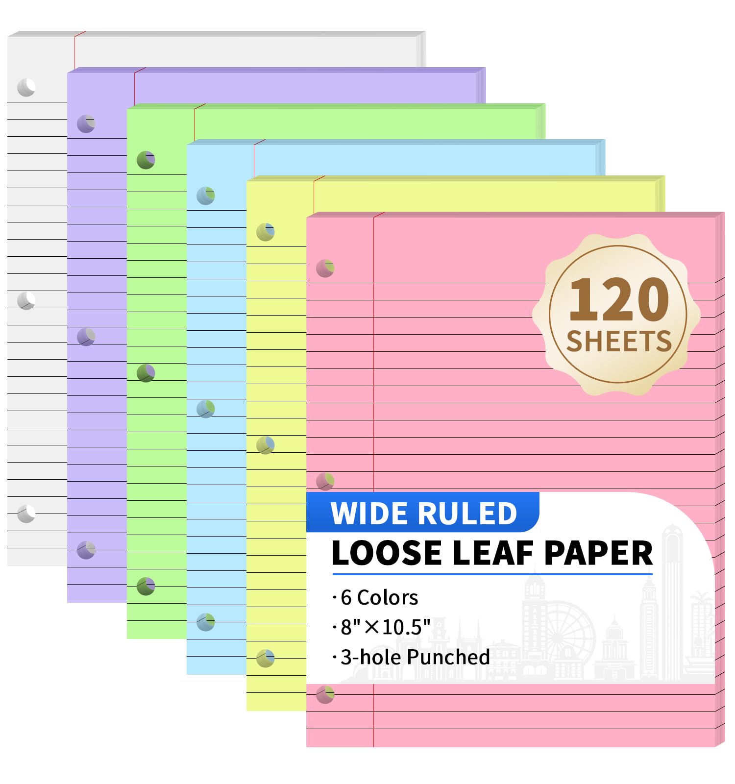 Universal BrandsSheets Loose Leaf Binder Paper, 6-Color Wide Ruled Lined Paper, 8” x 10.5”, 3-Hole Punched Notebook Paper Writing Paper for School Office: 120